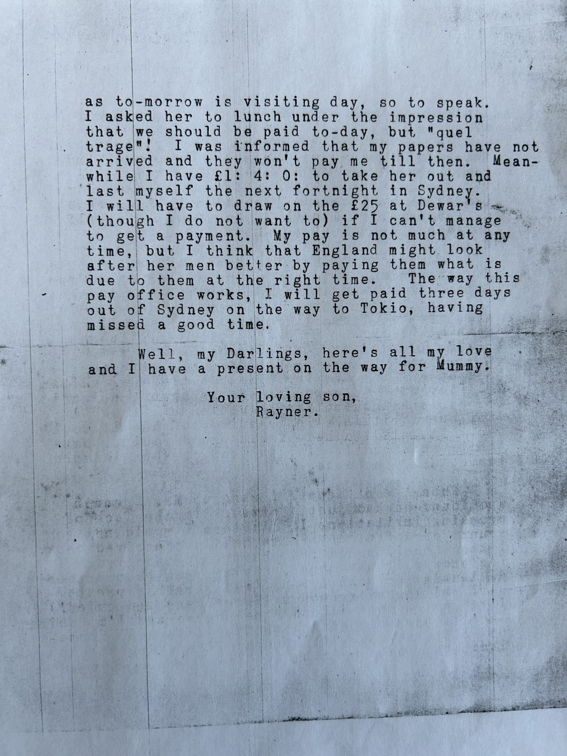 I especially liked the account of his meeting a pretty girl in Sydney, with whom he had arranged to date the next day but wondering how he was going to pay for lunch and survive for the next fortnight on £1 and 4 shillings as he had not been paid by the Navy!