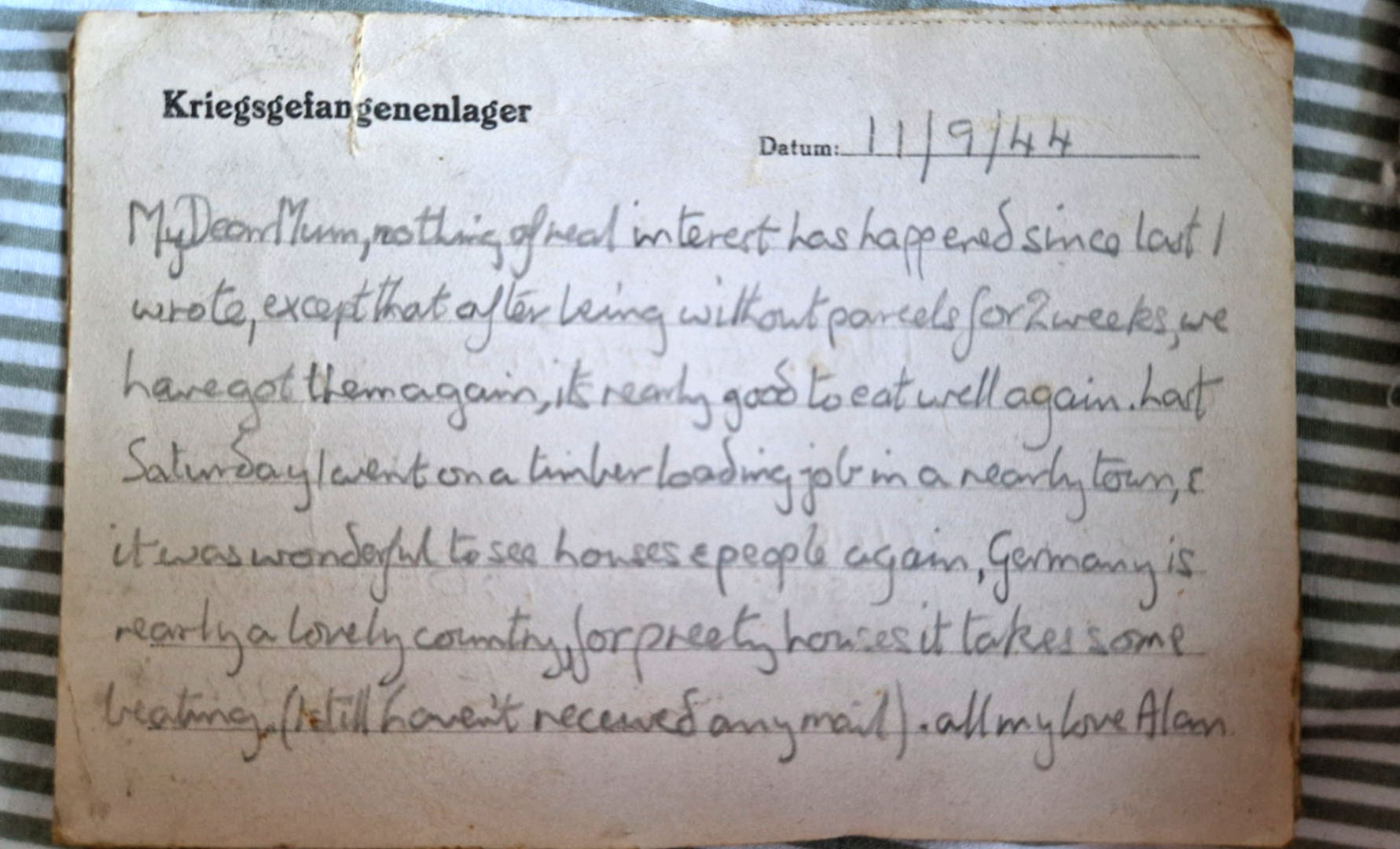 This letter is from when he was held at a camp in Germany and was sent on a timber logging job. He remarks on how nice Germany is.