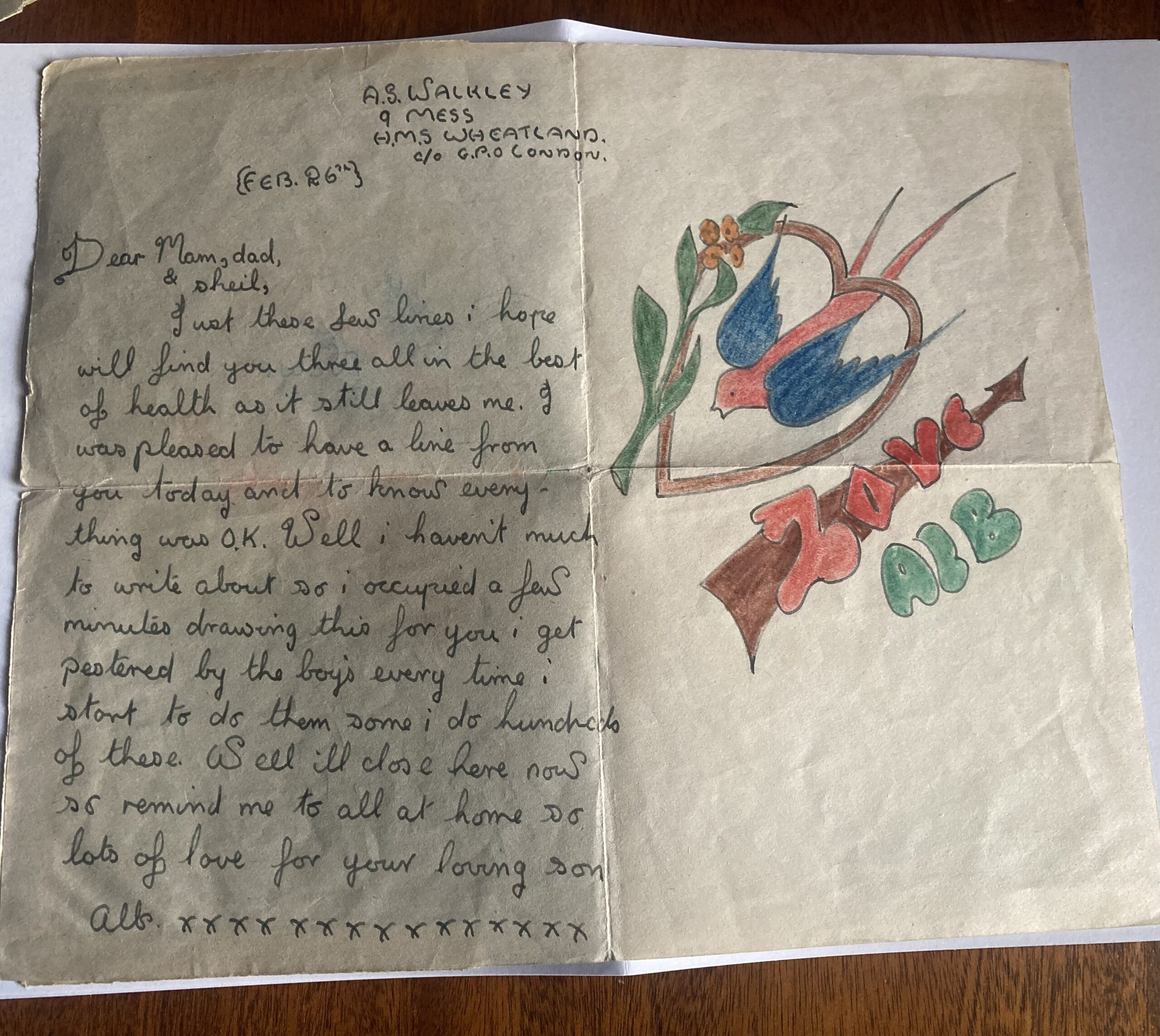 Feb 26th. 9 Mess, HMS Wheatland c/o GPO London