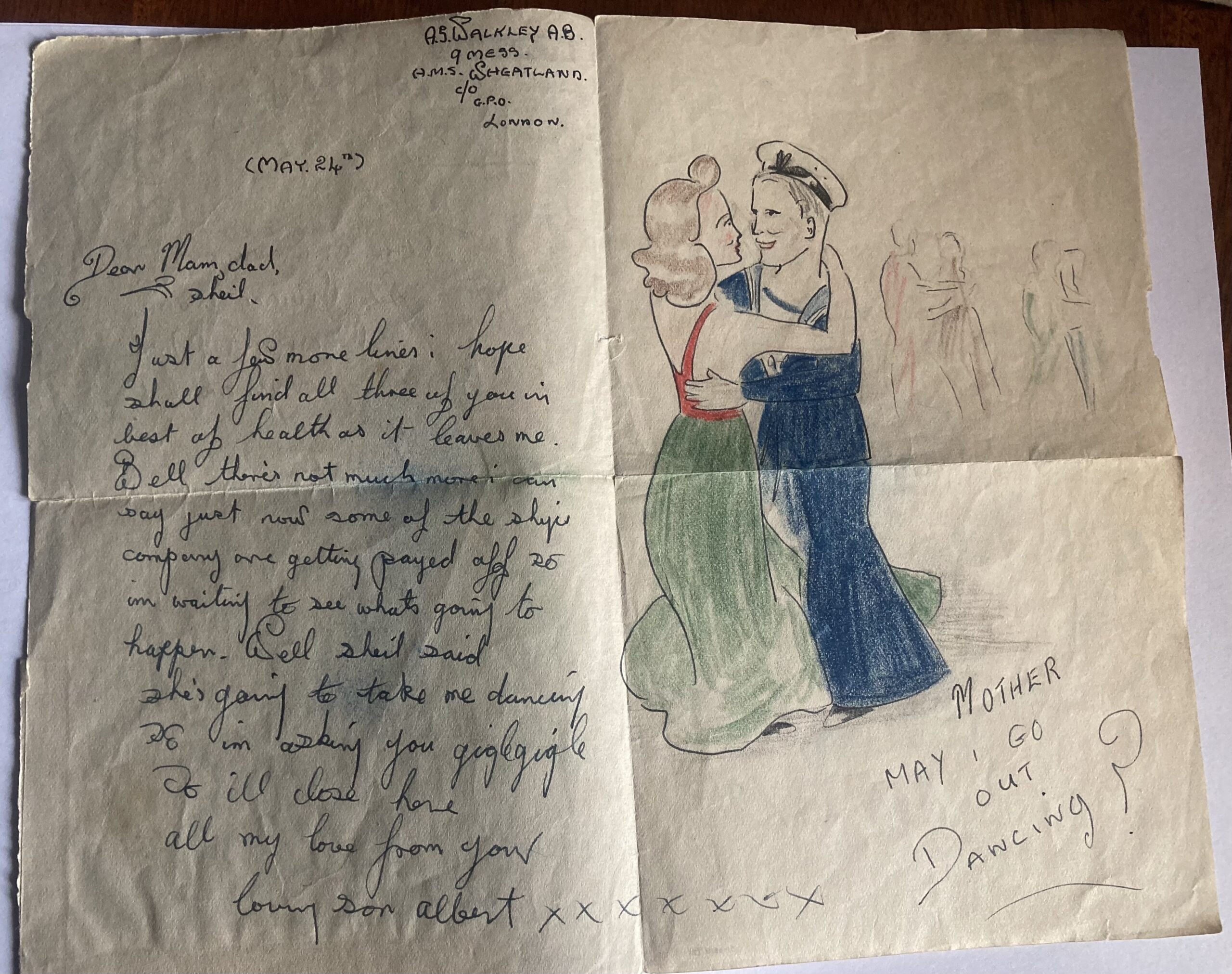 Just a few more lines i hope shall find all three of you in best of health as it leaves me. Well there's not much more i can say just now some of the ships company are getting payed off so im waiting to see whats going to happen. Well Sheil said she's going to take me dancing so im asking you giglegigle. So ill close here all my love from your loving son Albert xxxxxxx