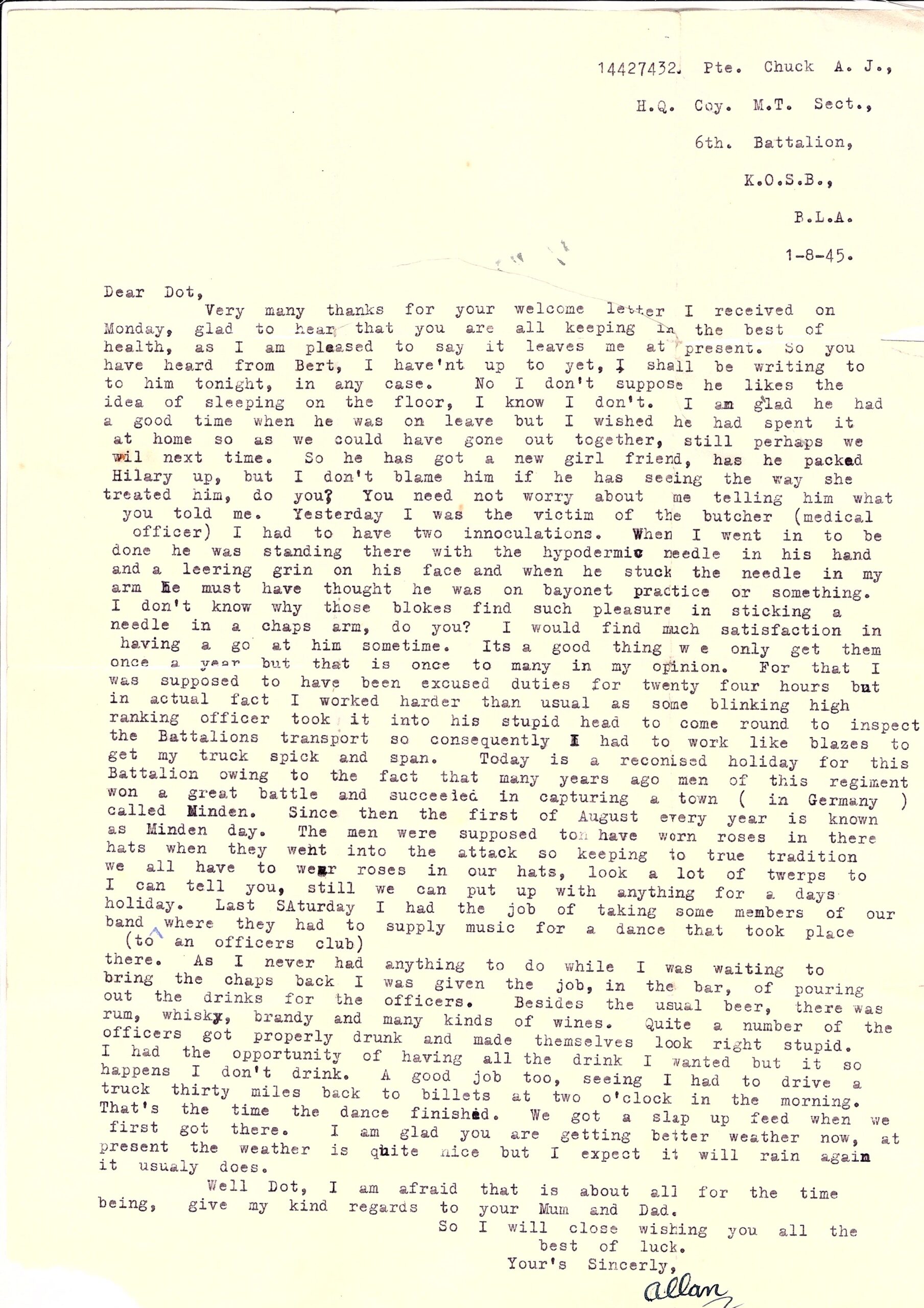 I found this letter 20 years ago whilst clearing out my mother’s house. My father was originally a pen friend to my mother, initiated by my mother’s brother. He was at one time in the Kings Own Scottish Borderers, as well as the Essex Regiment.