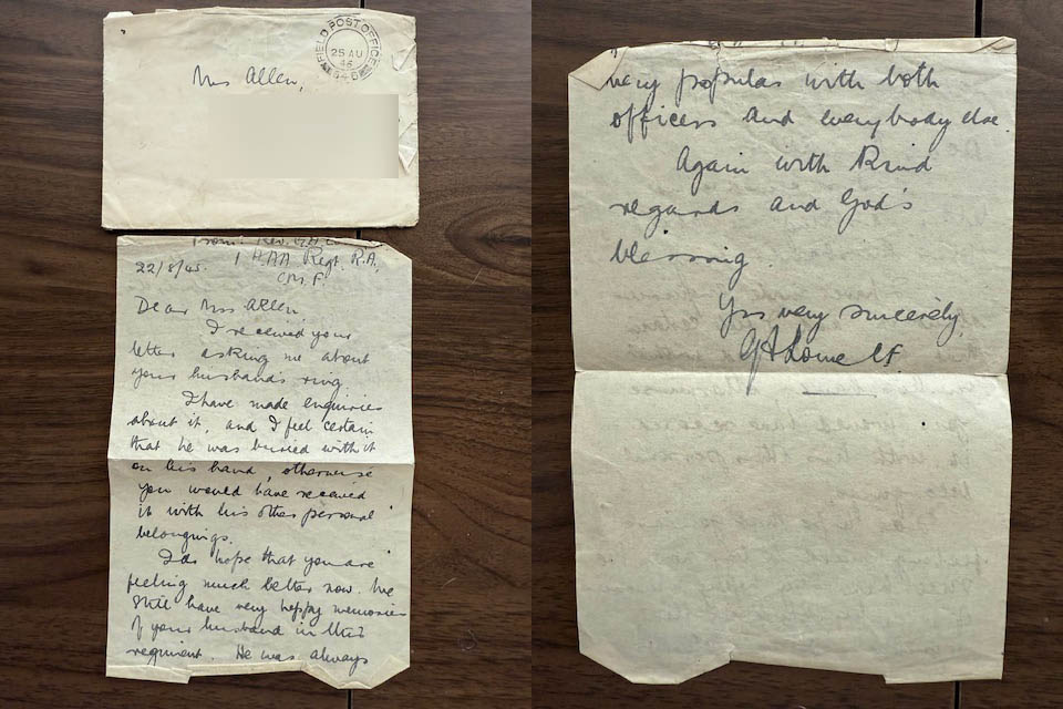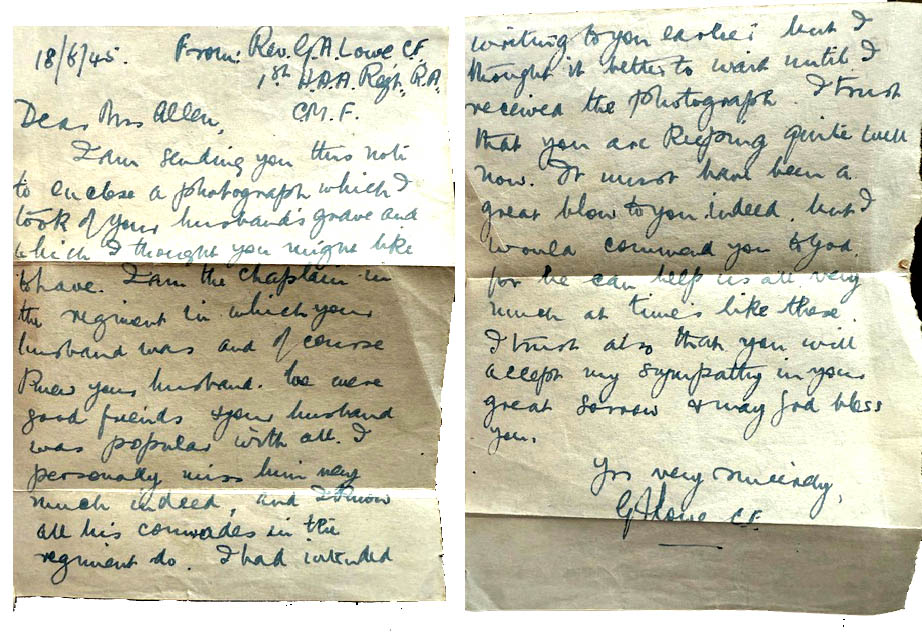 My mother gave me the letters before she passed. My nan celebrated VE Day in 1945 expecting my grandfather Richard James Allen (BDR No 97694) home from the war, unaware that he died on 22nd April 1945.