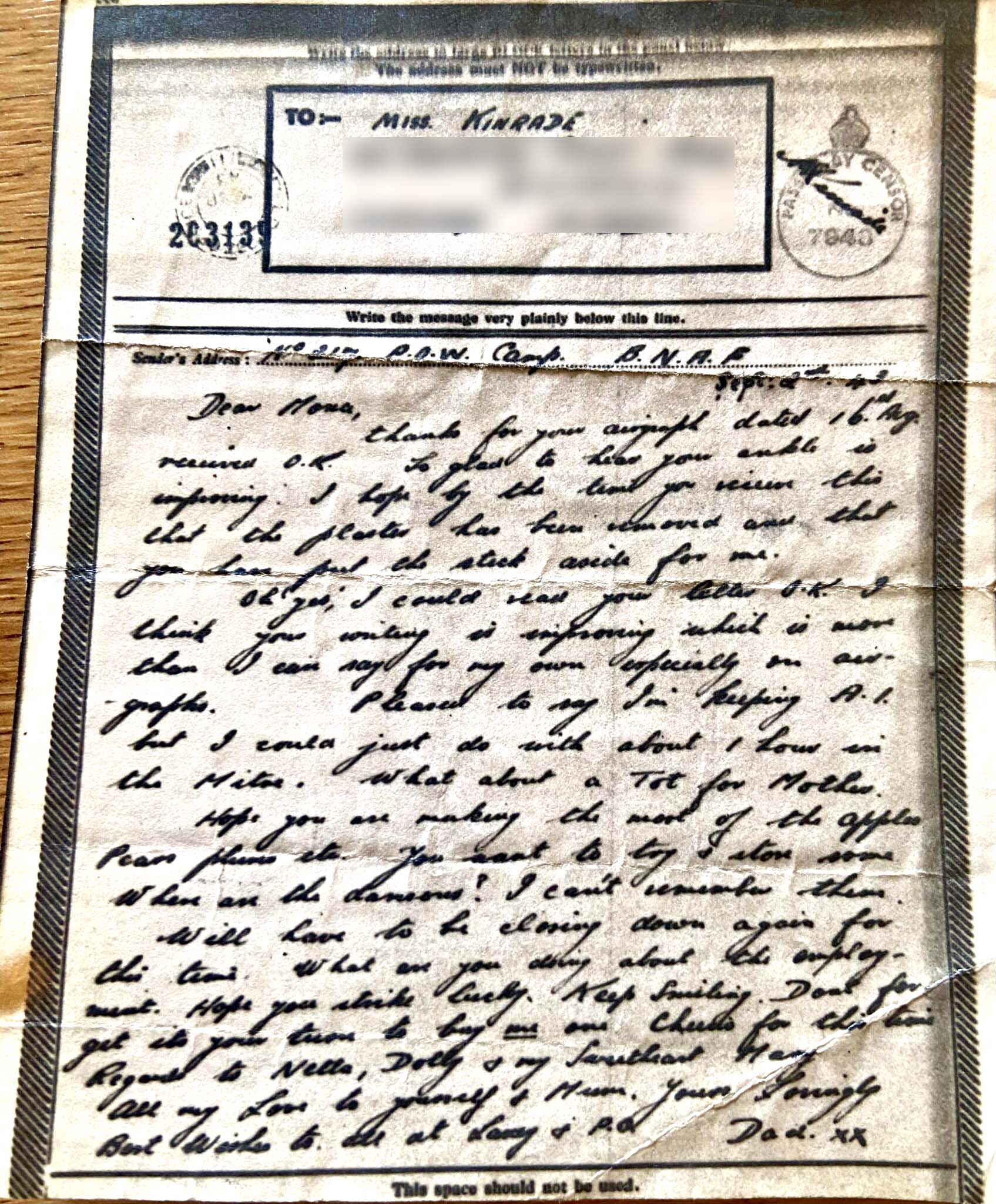 The letter is sent from my grandfather Arthur Kinrade to my mother Mona Fargher in 1943 as a reply to my mothers (his daughter’s) letter.