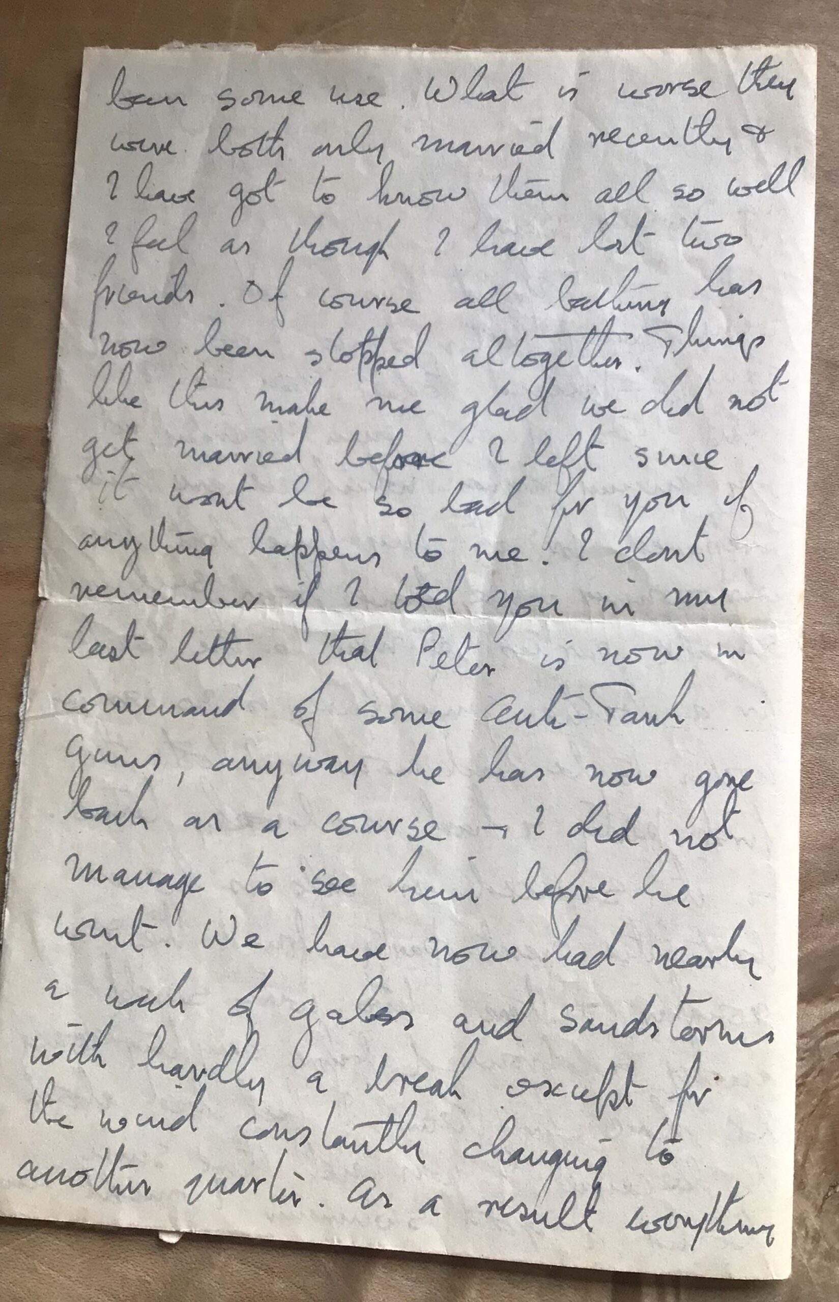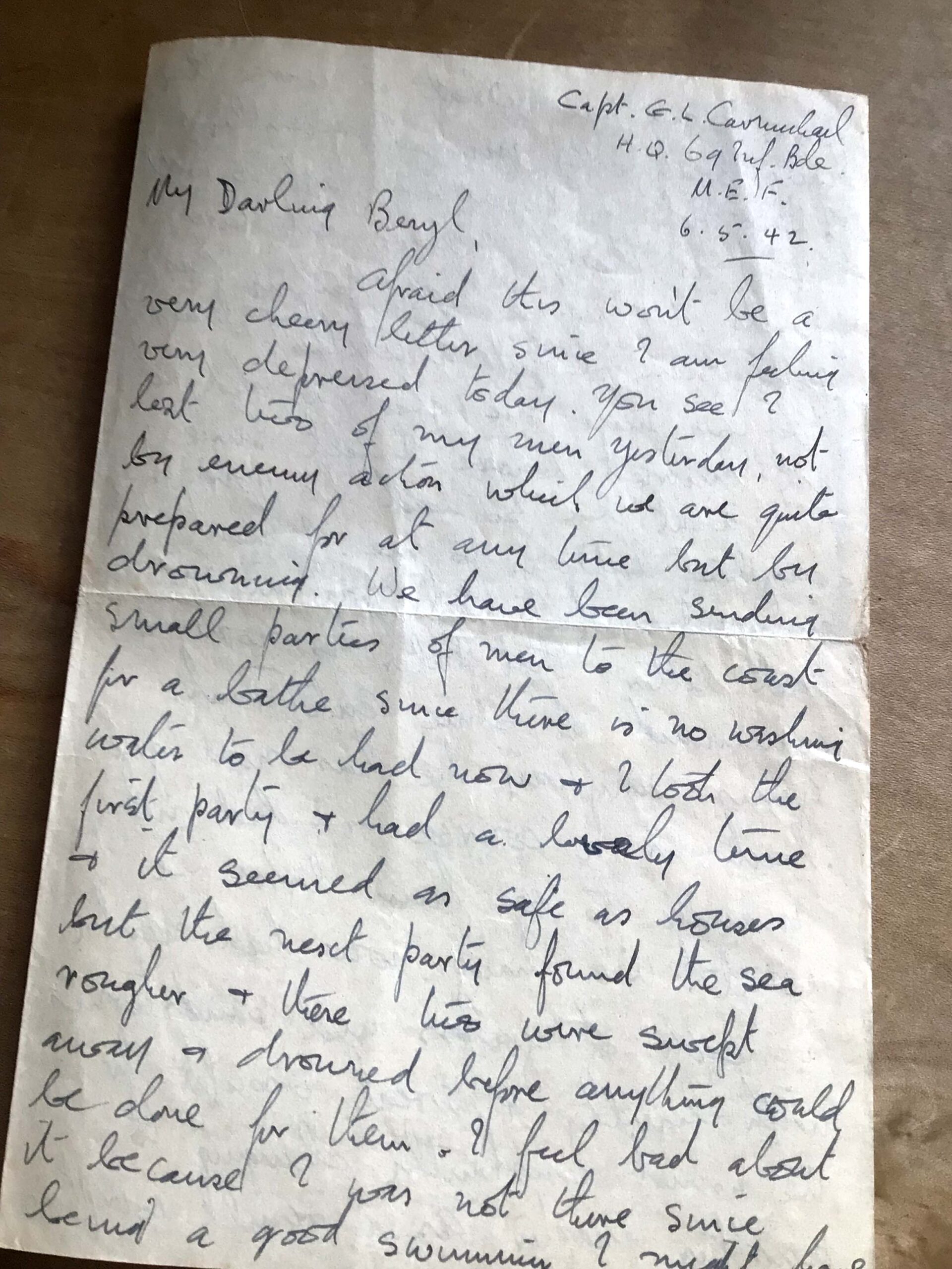 My father served with The Green Howards, and met my mother, who was in the A.T.S, when he was stationed in Somerset before being sent to fight. In this letter, he tells of his great sadness on the loss of two men who were drowned whilst swimming. They were in the desert near Gazala, and had gone for a swim in the sea, because they were living in dugouts, and they had no water to wash with. My father wished he could have been with them because he was a strong swimmer, and might have saved them. After this accident, the men were no longer allowed to swim in the sea.