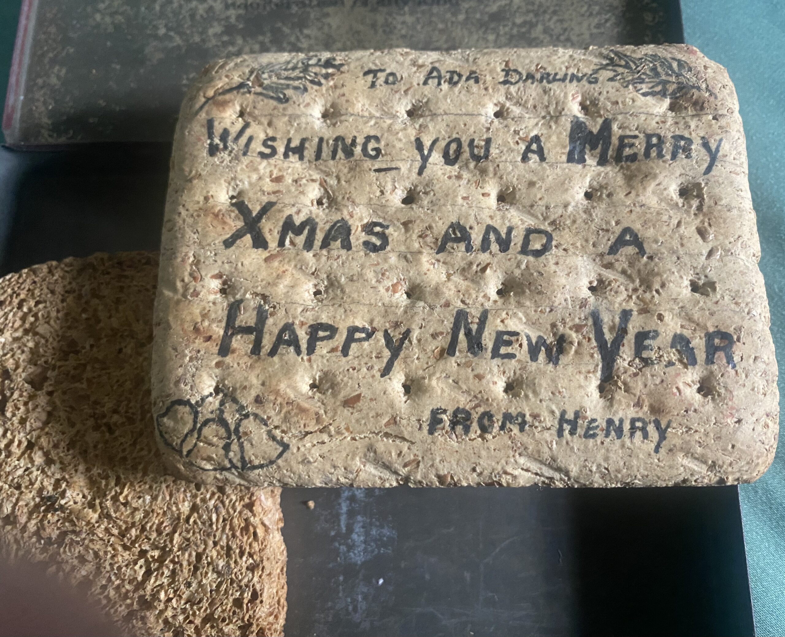 My mom’s father sent my grandmother a Christmas card in 1940, in a cigarette case, written on a WWll ration biscuit.