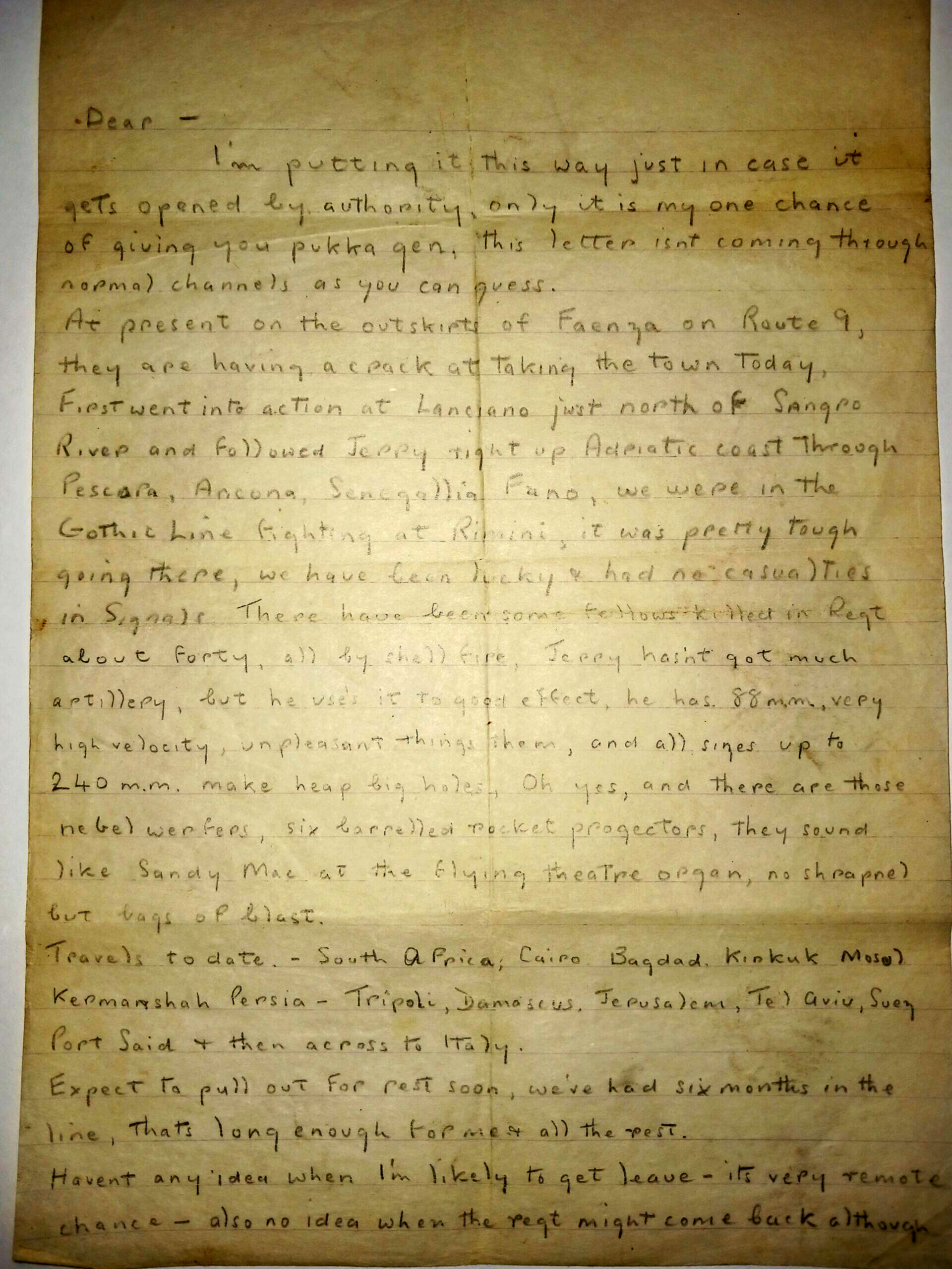 This letter was one he sent home via a friend going on leave who then posted it in London, a route to avoid the censor’s pen and to give a full explanation of his travels after he left home: