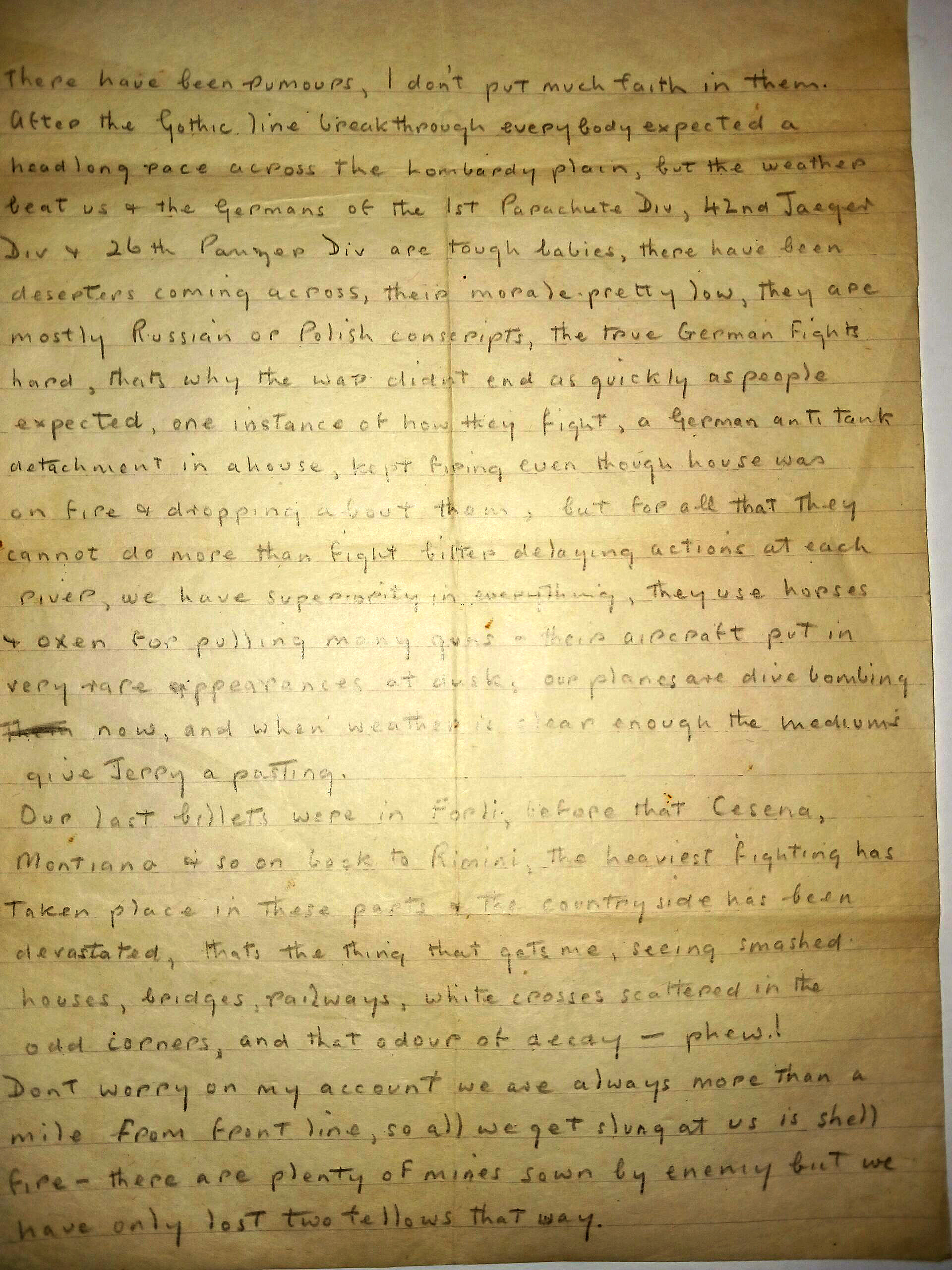 Along with letters were photographs detailing his journey from England out on a troopship to the eastern desert (Syria, Palestine and Iraq) and then onto a landing in Italy at Rimini. Then the hard slog up through Italy on the Adriatic coast. Gothic line and Po River Crossing. When the fighting ended he was then involved in moving the horses taken from the Cossack units fighting with the Germans to try and free Ukraine from Russian control over the Italian and Austrian Alps to use the horses to get agriculture going again. This was due to the many horses being taken from Austria to support the German war effort.