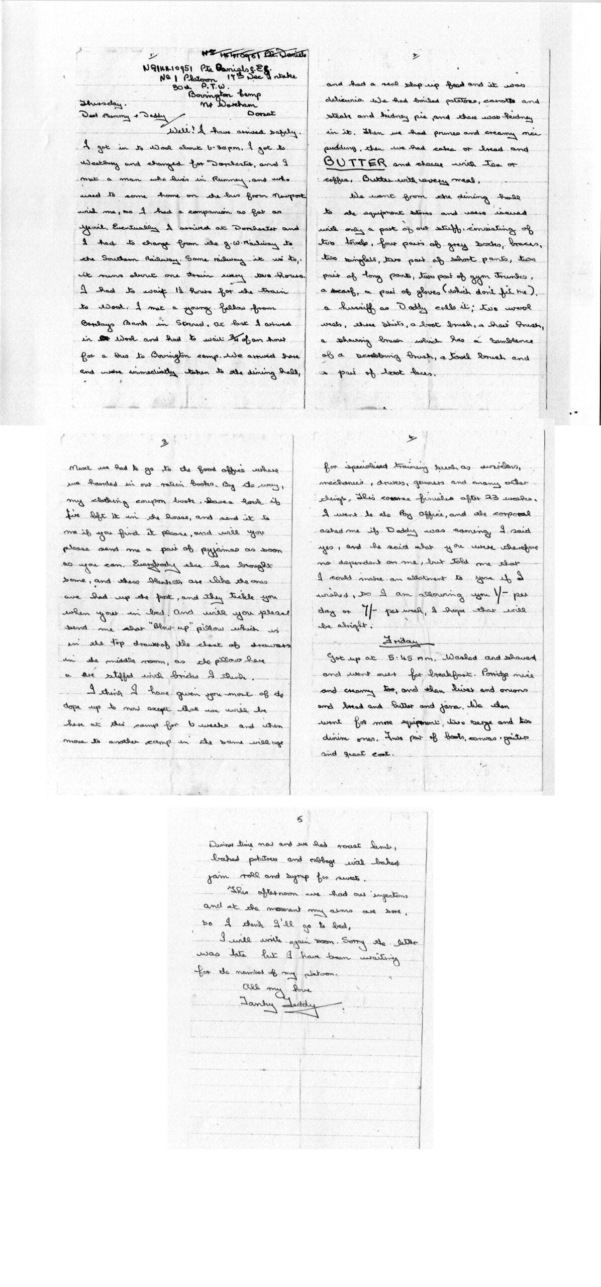 The first letter is a detailed and informative one to his parents of his journey to and first couple of days at base camp (Bovington Camp, near Wareham in Dorset).