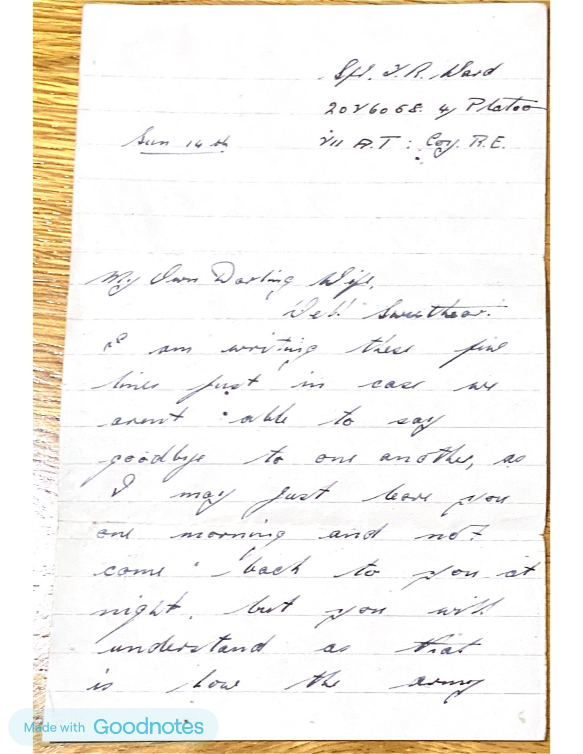 Well sweetheart, I am writing these few lines just in case we aren’t able to say goodbye to one another, as I may just leave you one morning and not come back to you at night, but you will understand as that is how the army works, if you feel like I do when you read this, I guess you must feel pretty full up.