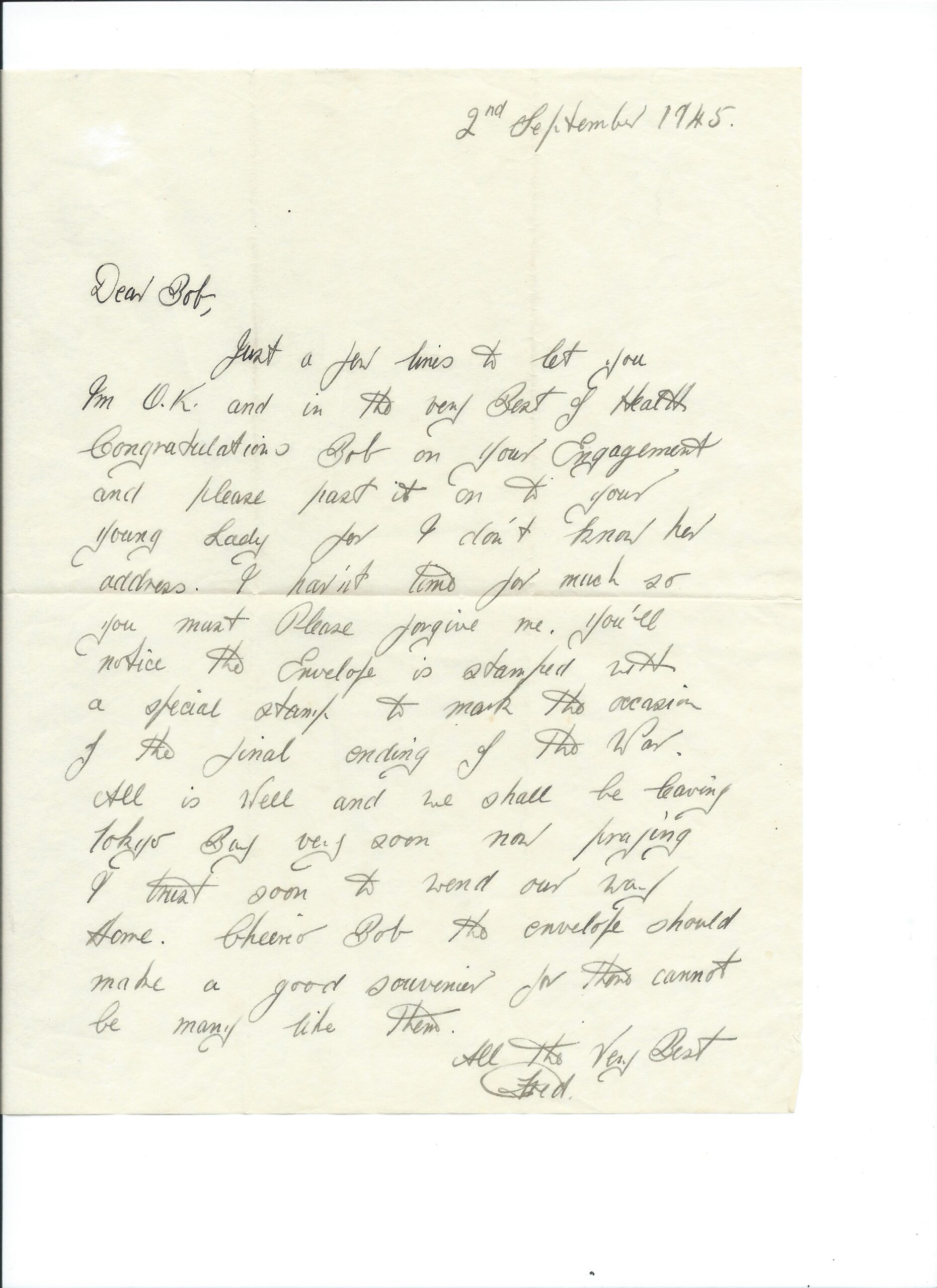 This letter from Fred is to his brother Bob. It is postmarked “2nd September, TOKYO BAY”. The letter was kept by Bob (my father) and I found it when my mother passed away, amongst all her photographs and Bob’s medals.