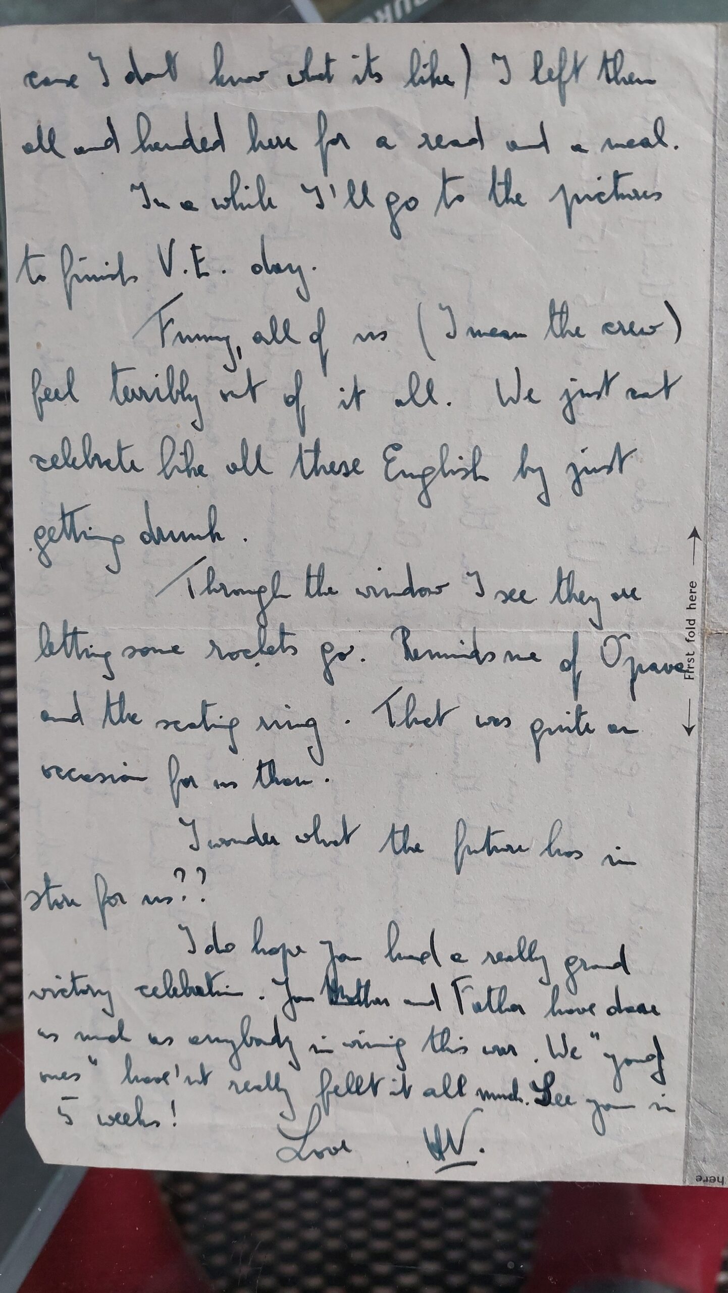 “Dear parents, the time 8.15, the day – V.E. Day and the place the services club. Below me singing in progress, outside singing, everywhere happiness. Pity it is, in so many cases, a drunken happiness. I am thinking of you all in England. I bet London is full of flag! Is there a Czech one fluttering from our windows? Pity not all of us can be together this day, still we will be soon. Meanwhile I could very well imagine you by the wireless while the King spoke. […] when I awoke the first thing I heard was the distant looming of Mr Churchill’s speech. I bumped into Maxine who took me to dinner with friends of hers. Very charming people, there dinner was concluded with champagne. For the first time I had any. There was lots of talking of course. Then the King’s speech at three and another dip into the sea. Feeling no urge to get drunk (that’s most probably because I don’t know what it’s like) I left them all and headed here for a read and a meal. In a while I’ll go to the pictures to finish V.E. day. Funny, all of us, I mean the crew, feel terribly out of it all. We just can’t celebrate like all these English by just getting drunk. Through the window I see they are letting some rockets go. Reminds me of Opava and the skating rink. That was quite an occasion for us then. I wonder what the future has in store for us?? I do hope you had a really grand victory celebration. You Mother and Father have done as much as anybody in winning this war, we young ones haven’t really felt it all much. See you in five weeks, Love H”