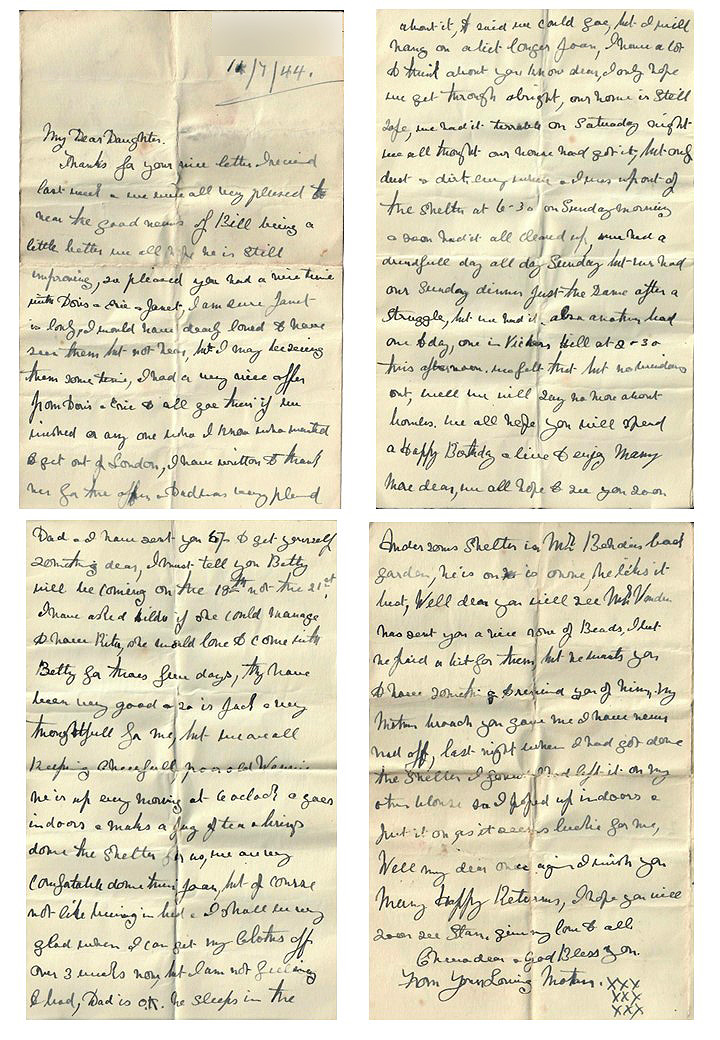 The letter was written by Hilda to her daughter on the 11th July 1944. Enclosed with the letter were two half crowns (five shillings) as a birthday gift for Joan’s 18th birthday on 12th July 1944. The two half crowns were never spent and became keepsakes passed on by my mother.
