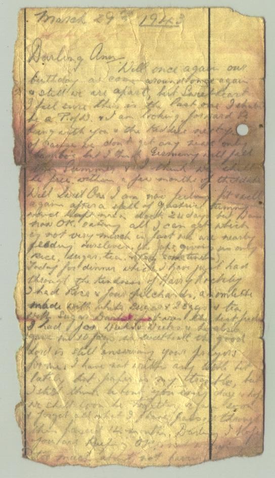 I also have an original letter written by him in 1945 upon his release and before he was brought home from Singapore. This is in quite frail shape being 80 years old. If you have any advice how to preserve it I would welcome that.