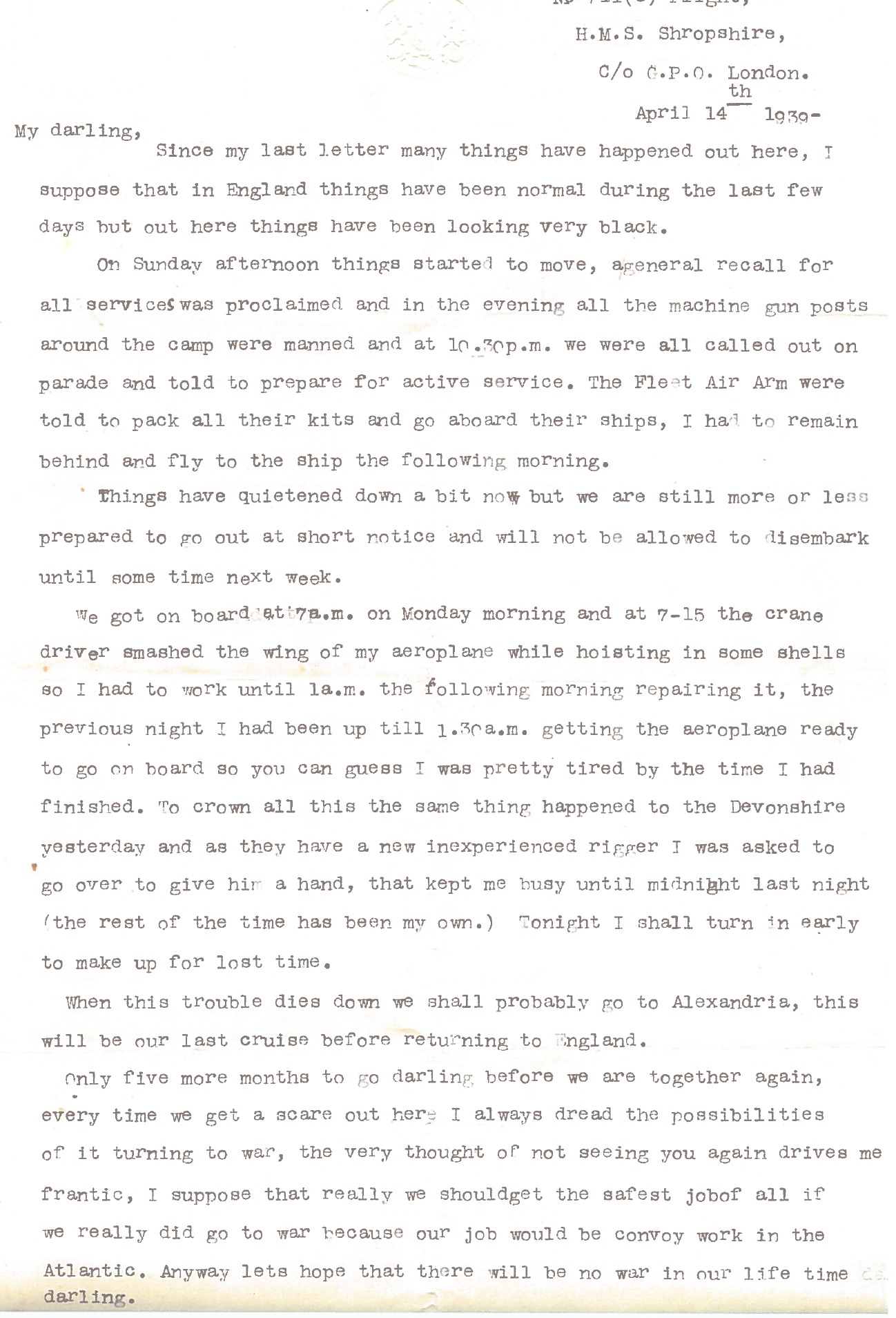 On the death of my uncle, I found some letters from my grandad to my nanna. This is just one which I thought most pertinent re the war as he wrote it in April 1939.