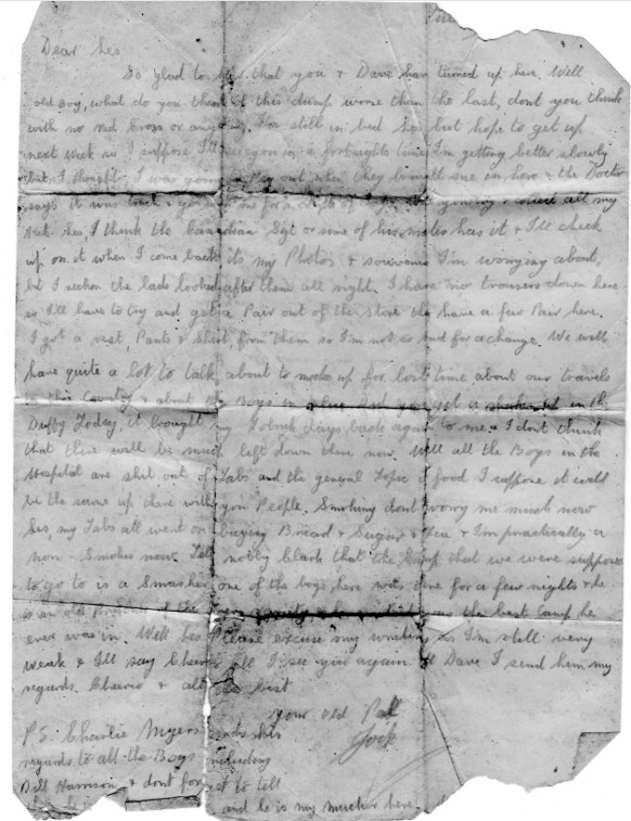 This letter to Les is from his friend Jock. I do not know of Jock’s full identity. It’s likely to have been sent in 1942 or 1943 in Italy while both were POWs, Jock being in hospital. The letter was written on very thin paper, was kept in a drawer at the family home in Wantage and discovered there in 2003.