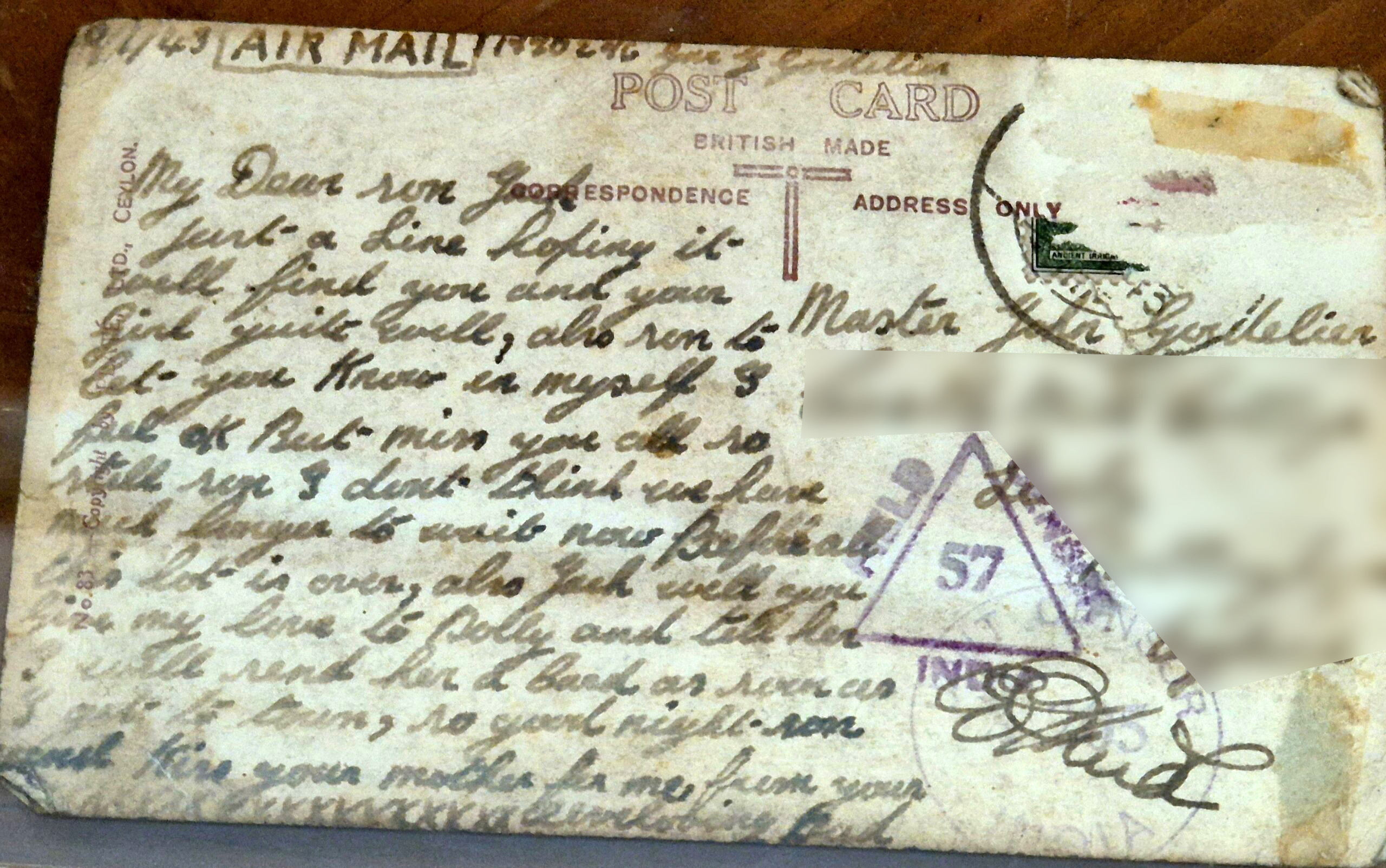 This photo and postcard were given to me by my uncle Bill, who kept it along with my Grandfather’s bush hat. I’m not sure how long he was in Ceylon, Burma. I do recall two stories my father told me about Grandad at that time.
