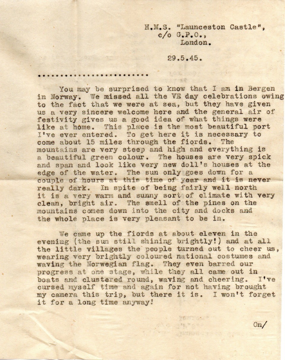 You may be surprised to know that I am in Bergen in Norway. We missed all the VE day celebrations owing to the fact that we were at sea, but they have given us a very sincere welcome here and the general air of festivity gives us a good idea of what things were like at home. This place is the most beautiful port I've ever entered. To get here it is necessary to come about 15 miles through the fiords. The mountains are very steep and high and everything is a beautiful green colour. The houses are very spick and span and look like very new doll's houses at the edge of the water. The sun only goes down for a couple of hours at this time of year and it is never really dark. In spite of being fairly well north it is a very warm and sunny sort of climate with very clean, bright air. The smell of the pines on the mountains comes down into the city and docks and the whole place is very pleasant to be in.