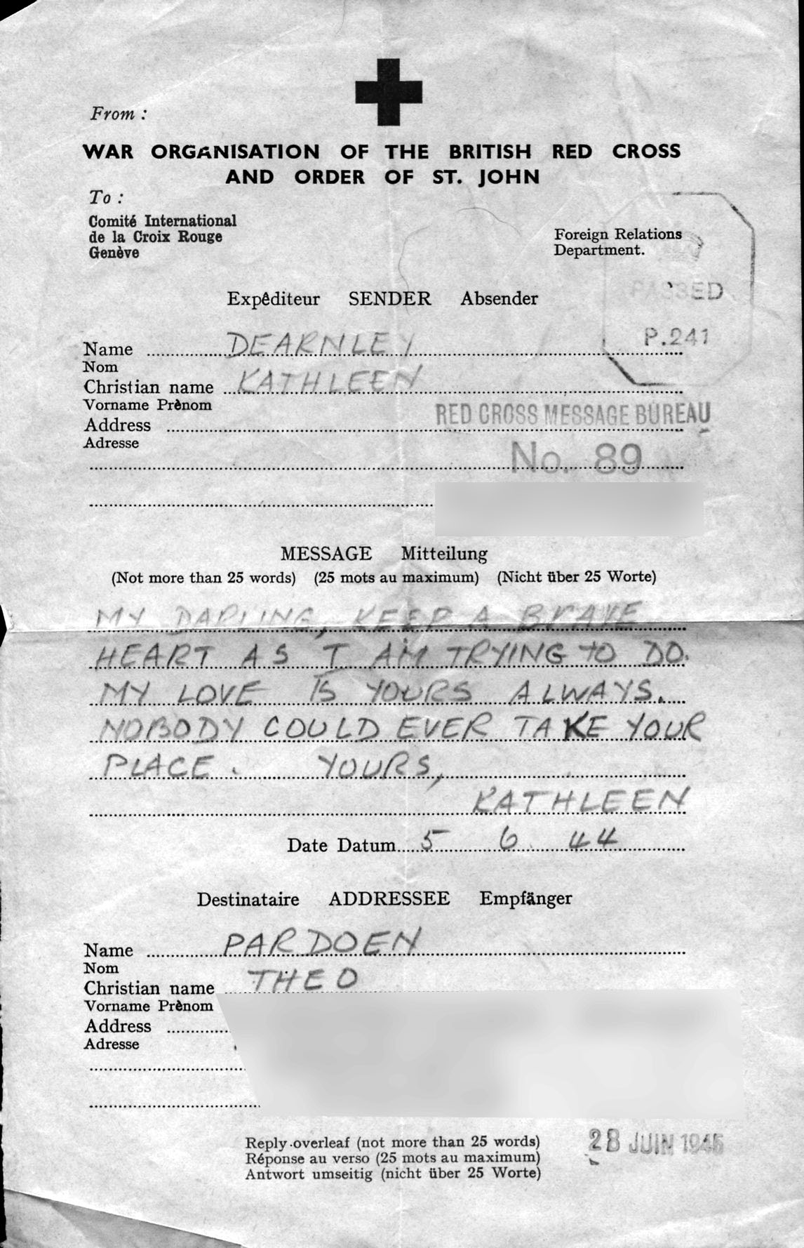 Theo only received the message after the war, if the date stamp at the bottom is correct. As soon as the war was over Theo became a translator for the Canadian army and as soon as possible he went over to England to visit Kathleen. They married in March 1946. Theo and Kathleen were my parents. This message of love we will always cherish.