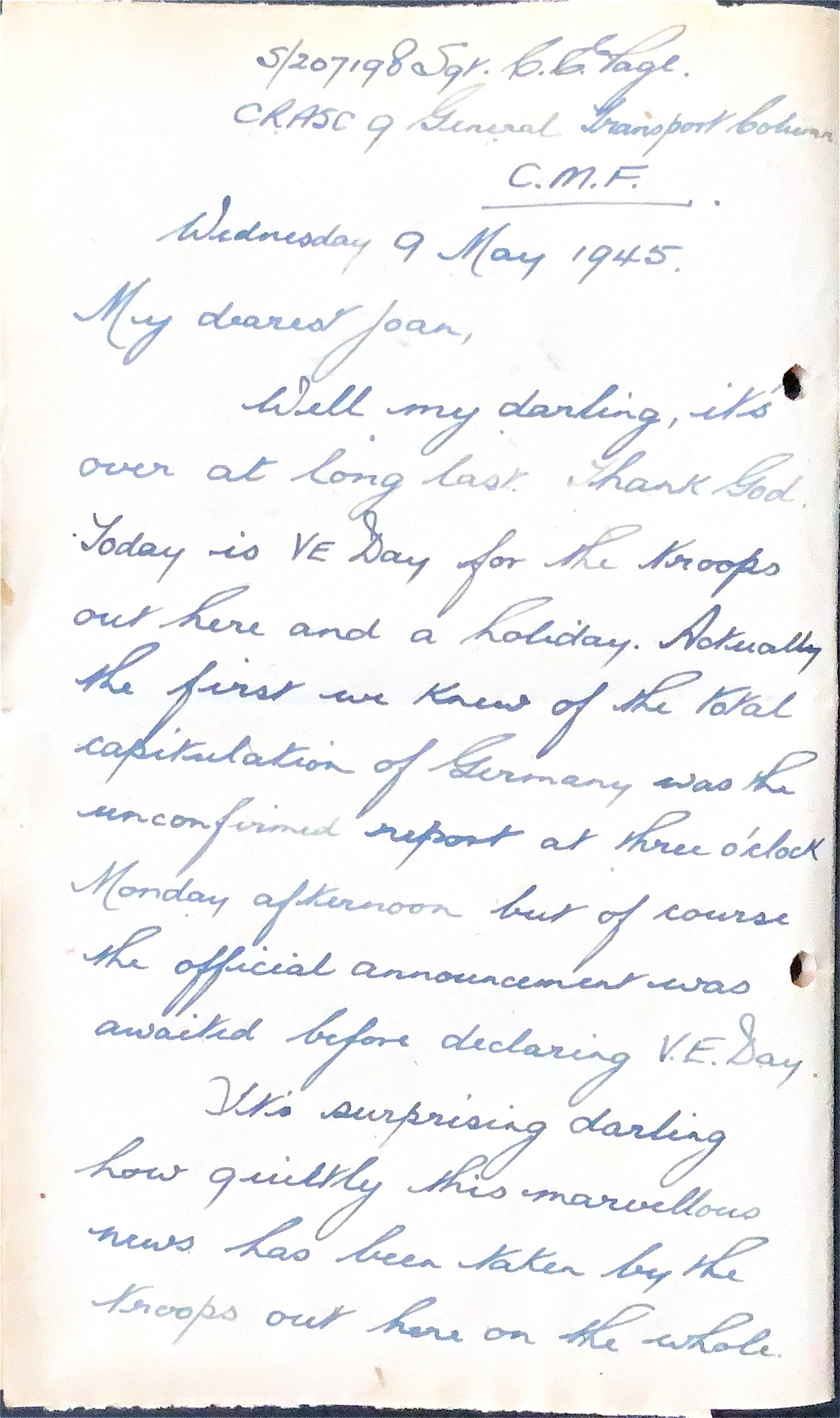 Well my darling, it’s over at long last. Thank God. Today is VE Day for the troops out here and a holiday. Actually the first we knew of the total capitulation of Germany was the unconfirmed report at three o'clock Monday afternoon but of course the official announcement was awaited before declaring V.E. Day.