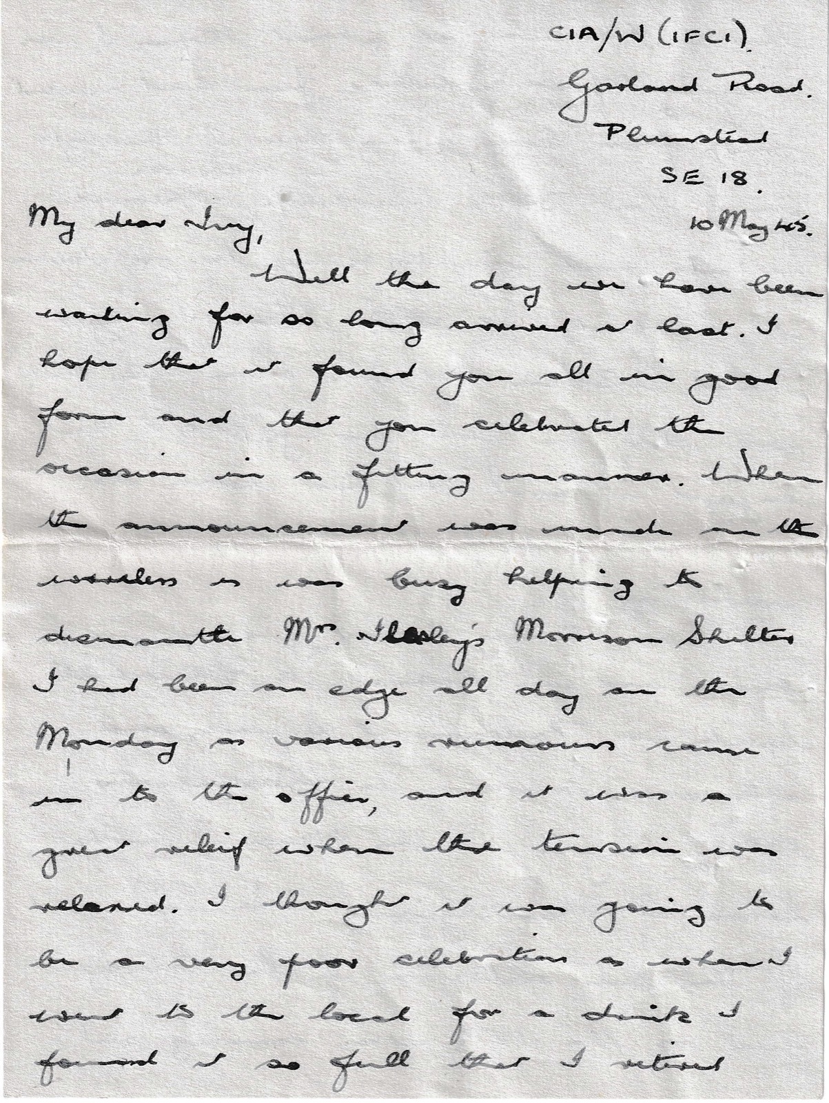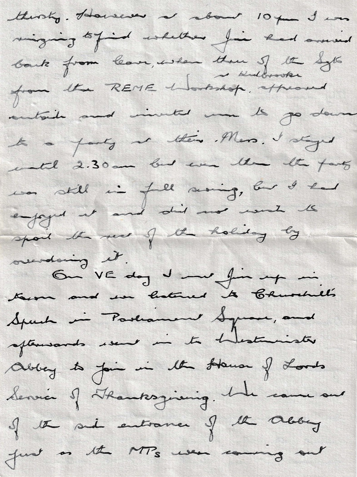 My father, Lieutenant Arthur Wear REME, was stationed at Woolwich. He met his brother Jim, who was on leave from the Desert Rats, and they wrote about what they did in London on VE day.