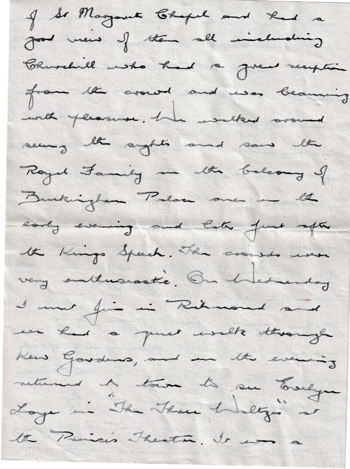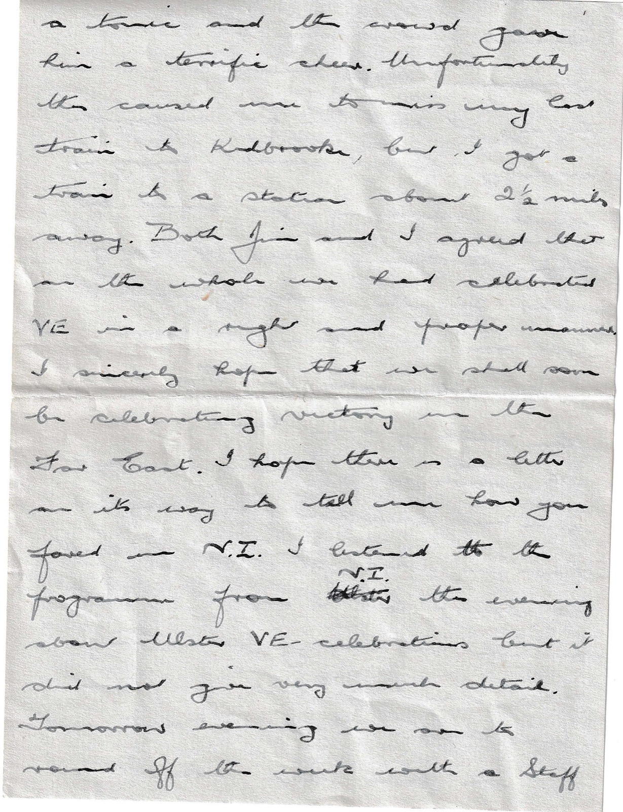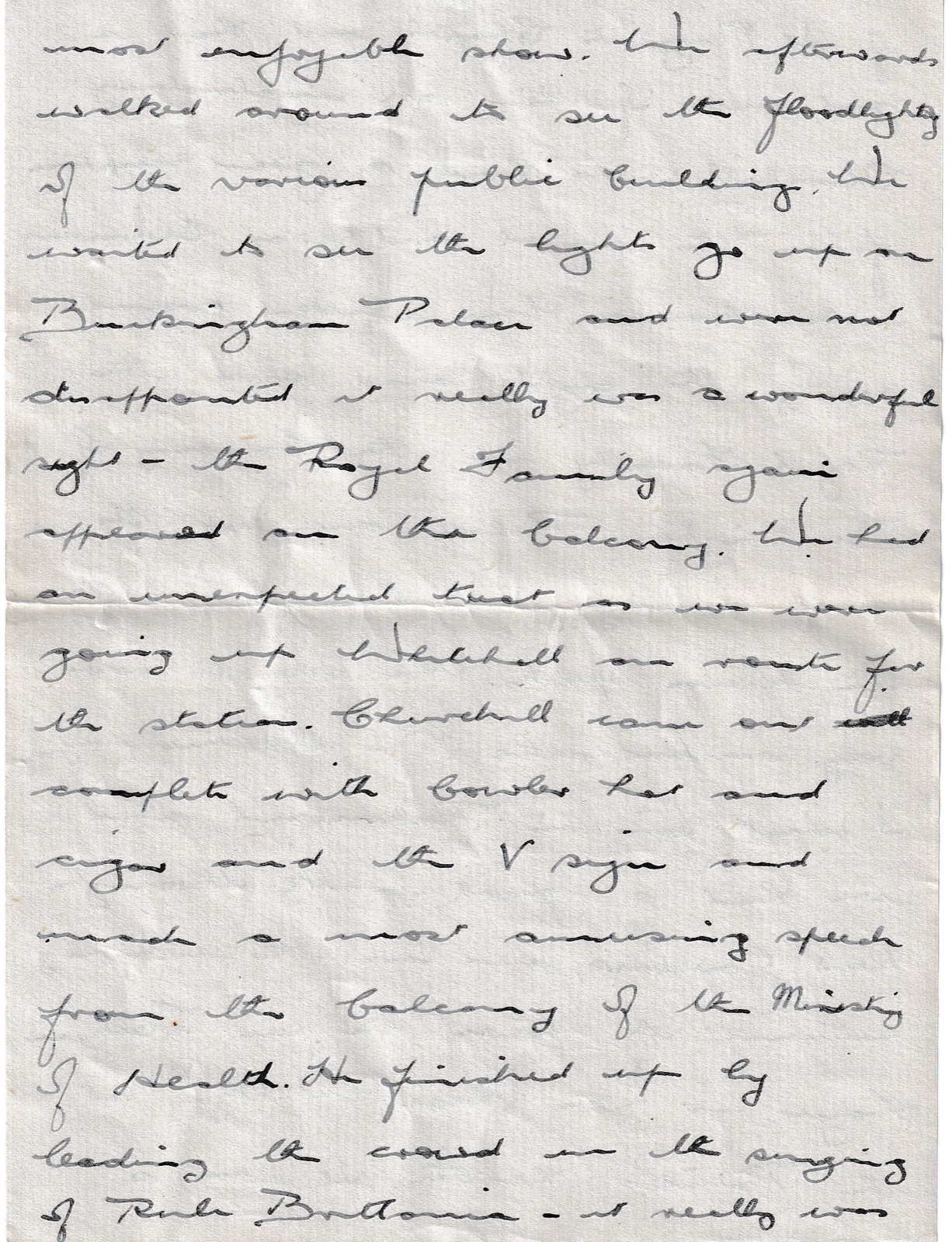 After helping his landlady demolish her bomb shelter they met up in central London, saw the MPs coming out of Westminster Abbey, saw the Royal Family on the balcony at Buckingham Palace, witnessed the lights coming on at Buckingham Palace, heard and saw Churchill speak from the Ministry of Health building, walked through Kew Gardens to enjoy the peace, enjoyed festivities at a Sargent’s Mess and subsequently he participated in an Officers Mess Dinner.