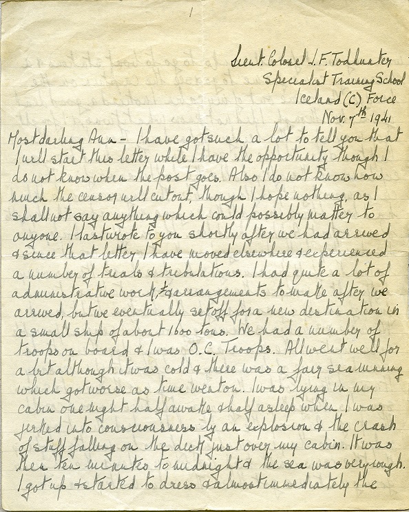 This 8-page letter is an account of a voyage to the north of Iceland where my father commanded the School of Winter Warfare.