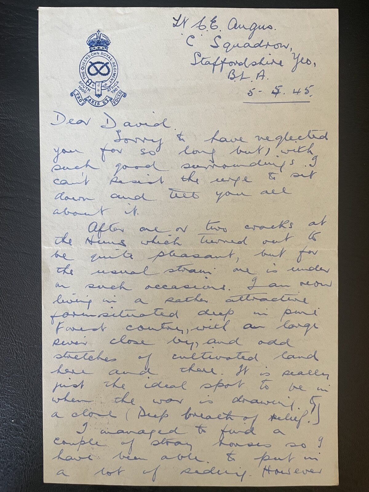 This letter is from my father, Lt Colin Ewart Angus – C Squadron Staffordshire Yeomanry, British Liberation Army (BLA) – to his brother David, 5 May 1945. I discovered it when sorting out my family’s letters and photographs from the war years.
