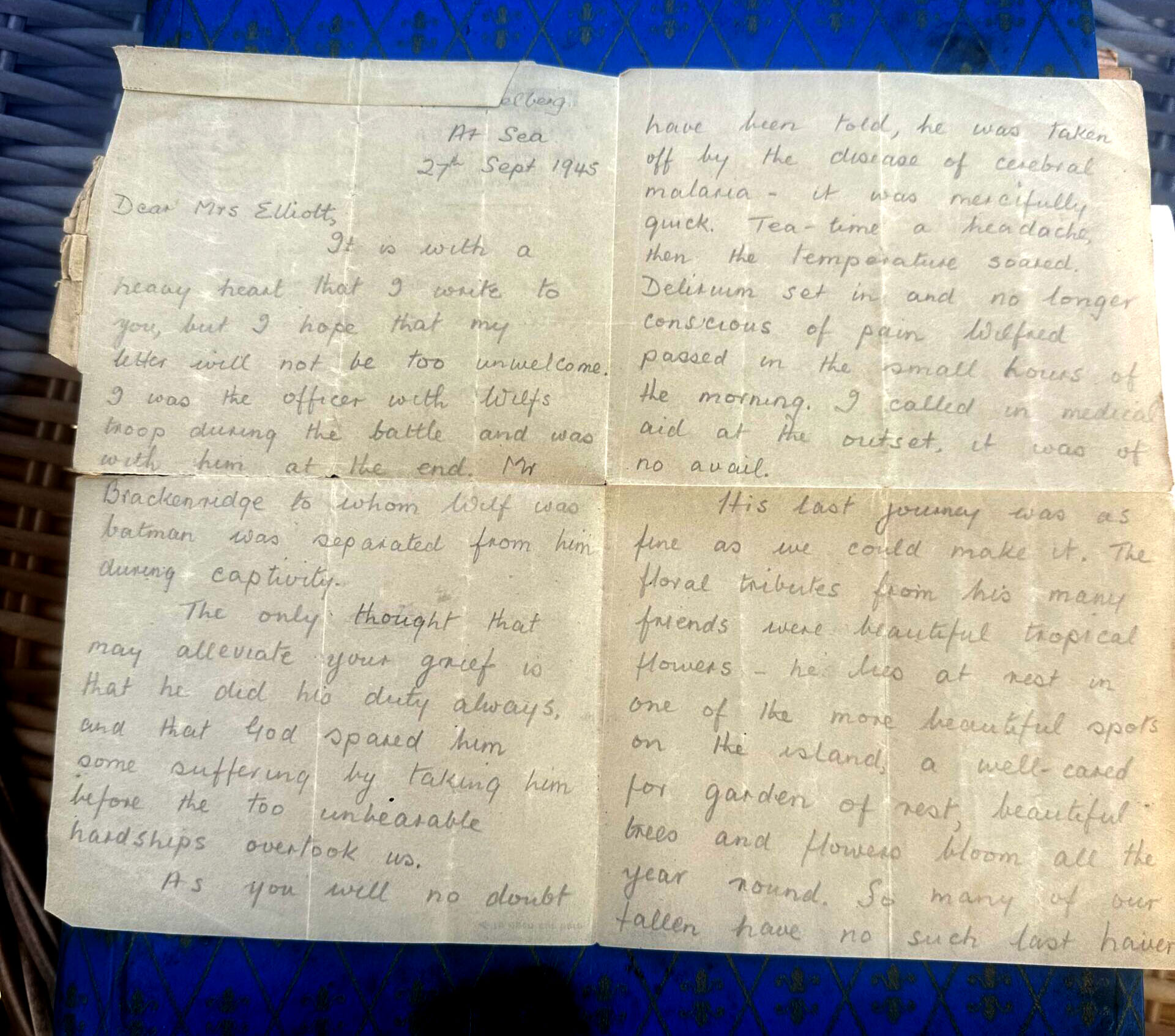 This is a letter to my grandmother Mary Elliot about my grandfathers passing (Wilfred Arthur Elliot) from an officer with Wilfred’s troop. He tells my grandmother that he was with my grandfather at the end as he died from malaria.