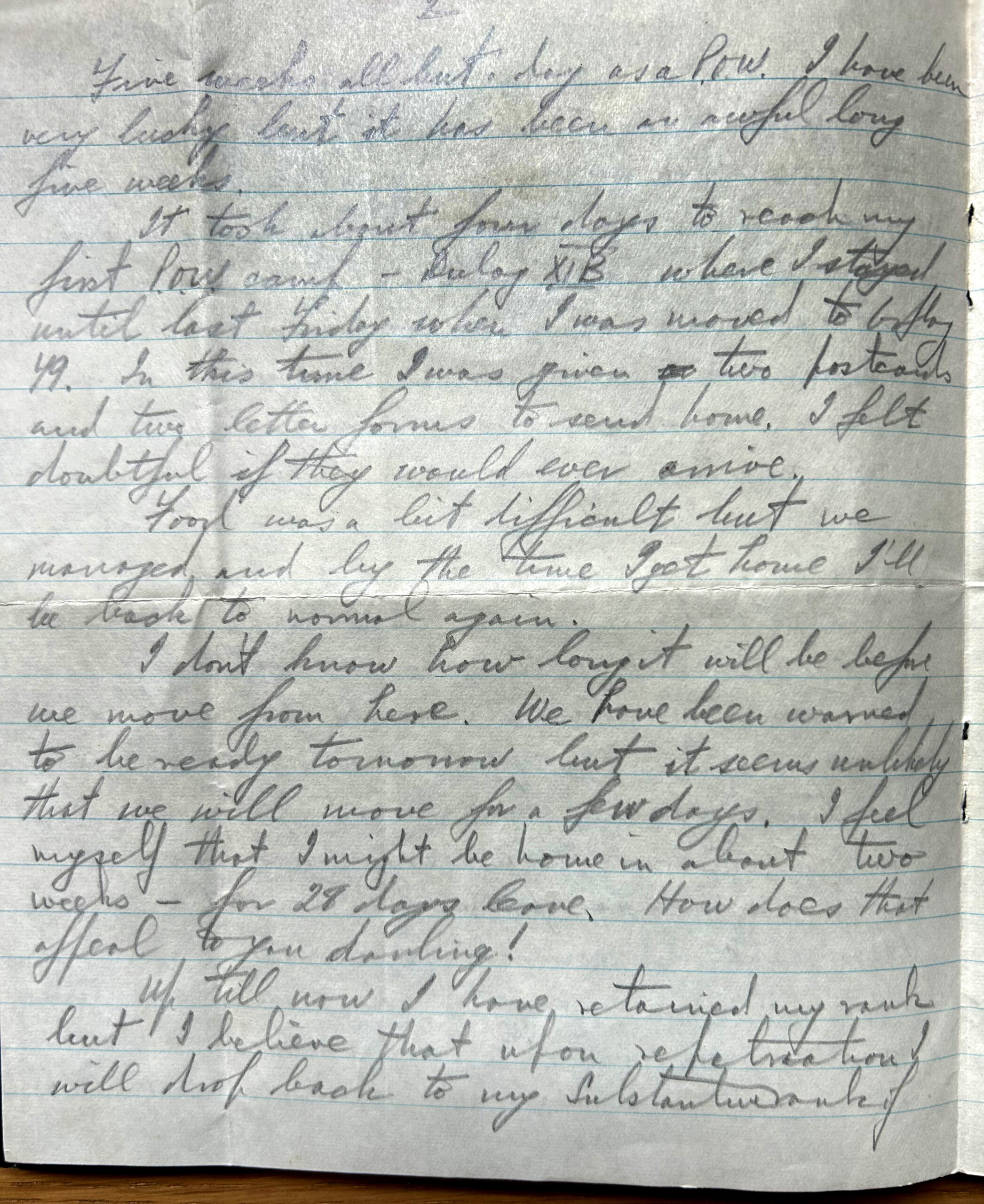 The letter pictured is from my grandfather to my grandmother after he went missing in action and was a prisoner of war (we also still have a letter that my grandmother received to say he was missing in action). My grandmother was living in Glasgow. During this time when my grandmother didn’t know whether my grandfather was ok, her mother had a dream where she saw my grandfather walking across a river and said he was fine but that he was frustrated.