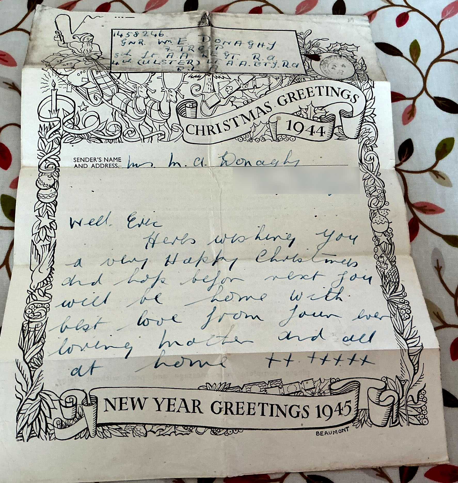 This is a Christmas greeting send on the 4th December 1944. The letter was with a number of documents my grandfather kept in a small box after the war.
