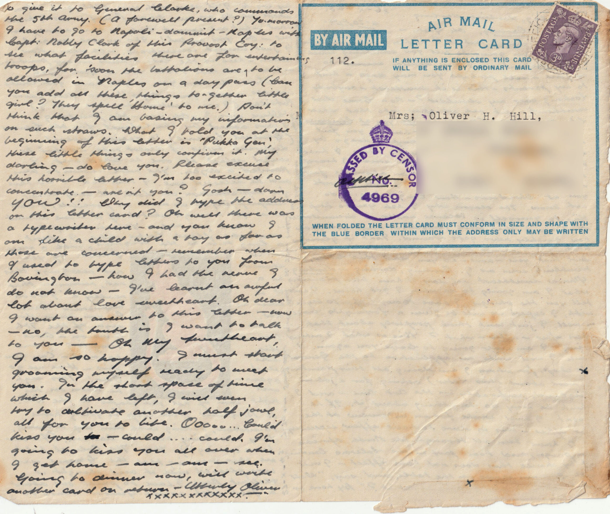That’s the news sweetheart – how do you feel now? Oh Gosh, the time simply drags by doesn’t it. Do you know Bunty mine I have been anything but sane, ever since I heard the news this morning. It is an absolute fact, and barring all accidents I will be with you at Christmas – How long before I do not know. The reason why I ask you to keep this to yourself is because under no circumstances do I want this move jeopardised – and you know how quickly news gets around. Isn’t it glorious darling – I cannot properly appreciate it – and I’m sure that you – now – as you read this letter, are trembling even as I. Darling, darling – darling Y'know sweetheart all day I have been planning what I am going to do when I get home. I will tell you the things I have thought of. To begin with, I expect we will be given a fortnights leave – well, I just can’t think properly about that. Then after – after – what? This is what I intend doing. I am never going to leave you again. I think I will write an application to the General (the chap, for whom I am doing all this painting – more about this later) asking for a job in England, preferably in the Art line – and I think he may do something about it. If he doesn’t I will write for an interview at the War Office – this is sure to have effect, especially as I have been all through the North African campaign, and took part in the Salerno landing. If by chance this does not have effect – I will just lay my cards on the table, and say, “Well what are you going to do about it?” By hook or [unclear] shall we do on our leave Bunty – yes I know that – but one cannot live by that alone, can one – Oh you awful! It’s no use my girl, I just cannot concentrate. – Oh dear – Now listen – here is the latest news on my paintings – how much have I told you – Gosh – Yeh – whew! do love you – You have got lovely breasts – and your legs!! and dear – dear Patricia (I can mention her now can’t I)