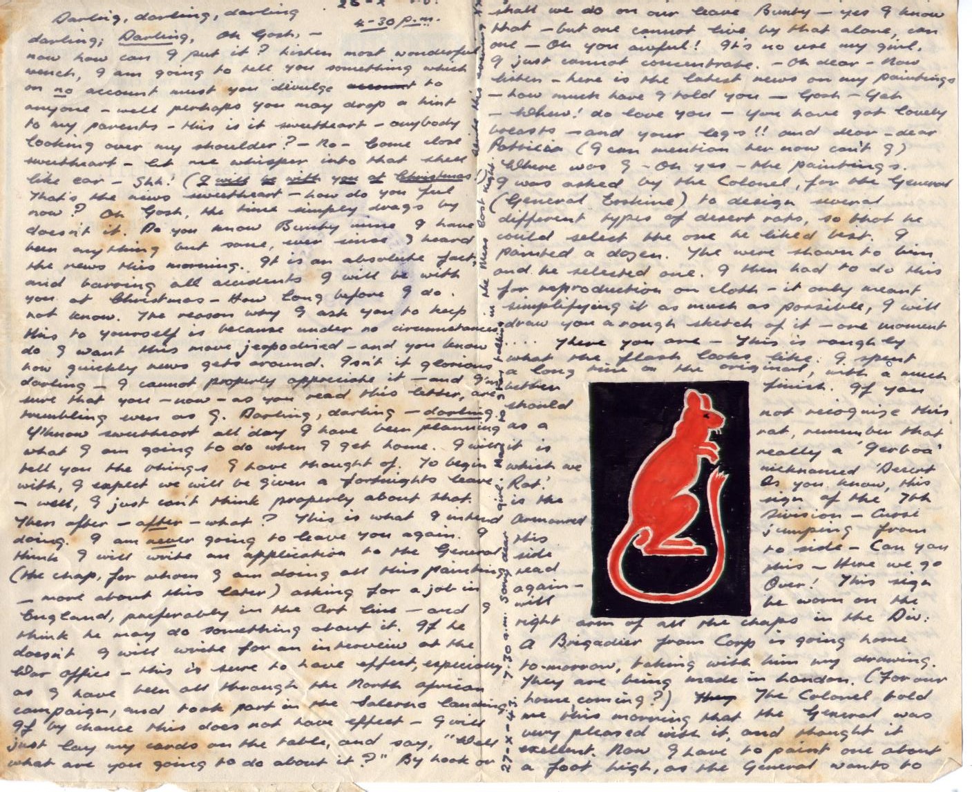 Where was I – Oh yes – the paintings. I was asked by the Colonel, for the General (General Erskine) to design several different types of desert rats, so that he could select the one he liked best. I painted a dozen. They were shown to him and he selected one. I then had to do this for reproduction on cloth – it only meant simplifying it as much as possible, I will draw you a rough sketch of it – one moment .... there you are – this is roughly what the flash looks like. I spent a long time on the original, with a much better finish. If you should not recognize this as a rat, remember that it is really a ‘Jerboa’ which we nicknamed ‘Desert Rat.’ As you know, this is the sign of the 7th Armoured Division – Curse this jumping from side to side – Can you read this – Here we go again – Over! This sign will be worn on the right arm of all the chaps in the Div: a Brigadier from Corp is going home to-morrow, taking with him my drawing. They are being made in London. (For our home coming?) The Colonel told me this morning that the General was very pleased with it, and thought it excellent. Now I have to paint one about a foot high, as the General wants to give it to General Clarke, who commands the 5th Army. (A farewell present?) To-morrow I have to go to Napoli – dammit – Naples with Capt: Noble Clark of this Provost Coy: to see what facilities there are for entertaining troops, for soon the battalions are to be allowed in Naples on a day pass (Can you add all these things to-gether little girl? They spell ‘Home’ to me.) Don’t think that I am basing my information on such straws. What I told you at the beginning of this letter is ‘Pukka Gen’, these little things only confirm it. My darling – do love you. Please excuse this horrible letter – I’m too excited to concentrate – aren't you? Gosh – damn YOU!! Why did I type the address on this letter card? Oh well there was a typewriter here – and you know I am like a child with a toy as far as those are concerned – remember when I used to type letters to you from Bovington – how I had the nerve I do not know – I’ve learnt an awful lot about love sweetheart. Oh dear I want an answer to this letter – now – no, the trouble is I want to talk to you – Oh my sweetheart, I am so happy. I must start grooming myself ready to meet you. In the short space of time which I have left, I will even try to cultivate another half jowl, all for you to like. Ooooo... Could kiss you – could.... could. I’m going to kiss you all over when I get home – am – am – see. Going to dinner now, will write another card on return. – Utterly Oliver xxxxxxxxxxxx.