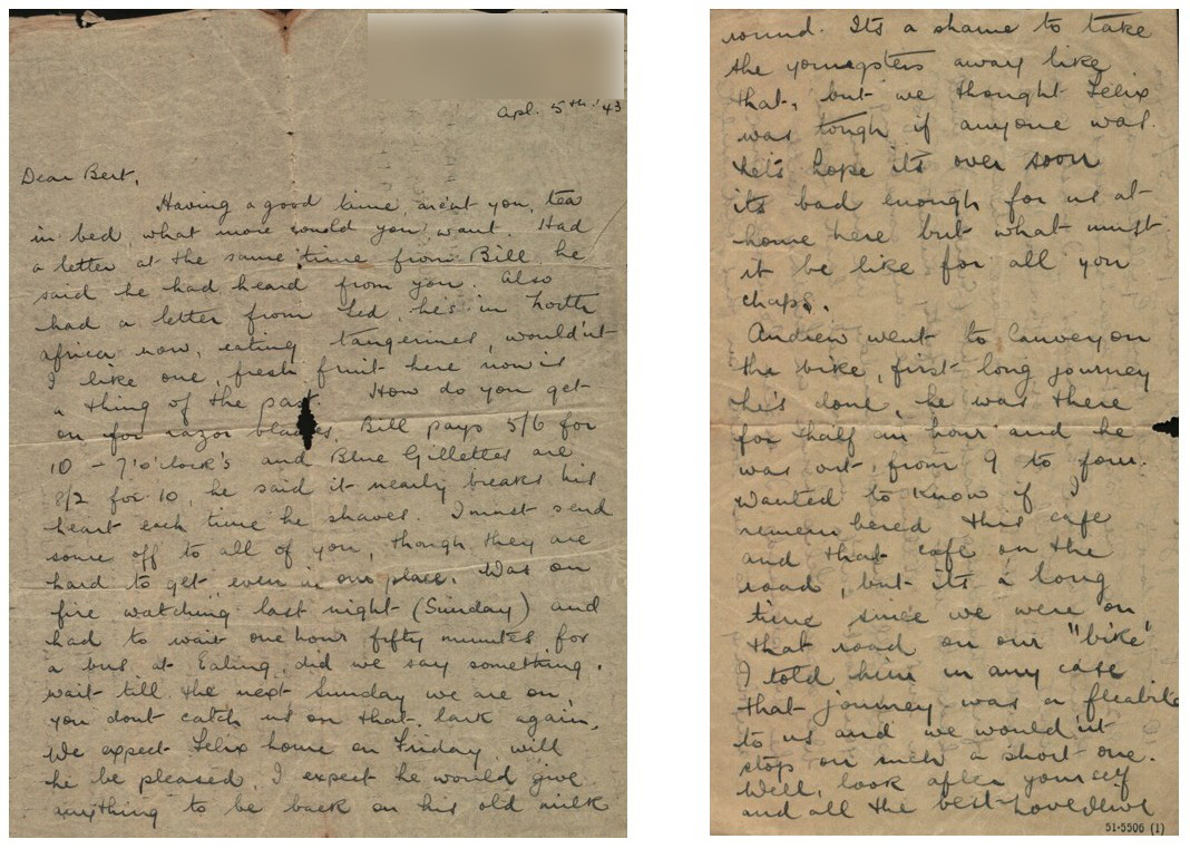 Olly had five brothers all of whom served their country during WW2: Bill & Ted who she mentioned, had both recently written to her, ‘Felix’ & Andy both of whom she discussed in the letter, and John who had been accidentally killed in 1942 whilst serving as a chemist in the British oilfields of Bahrain. Andy was the youngest and had not yet enlisted.