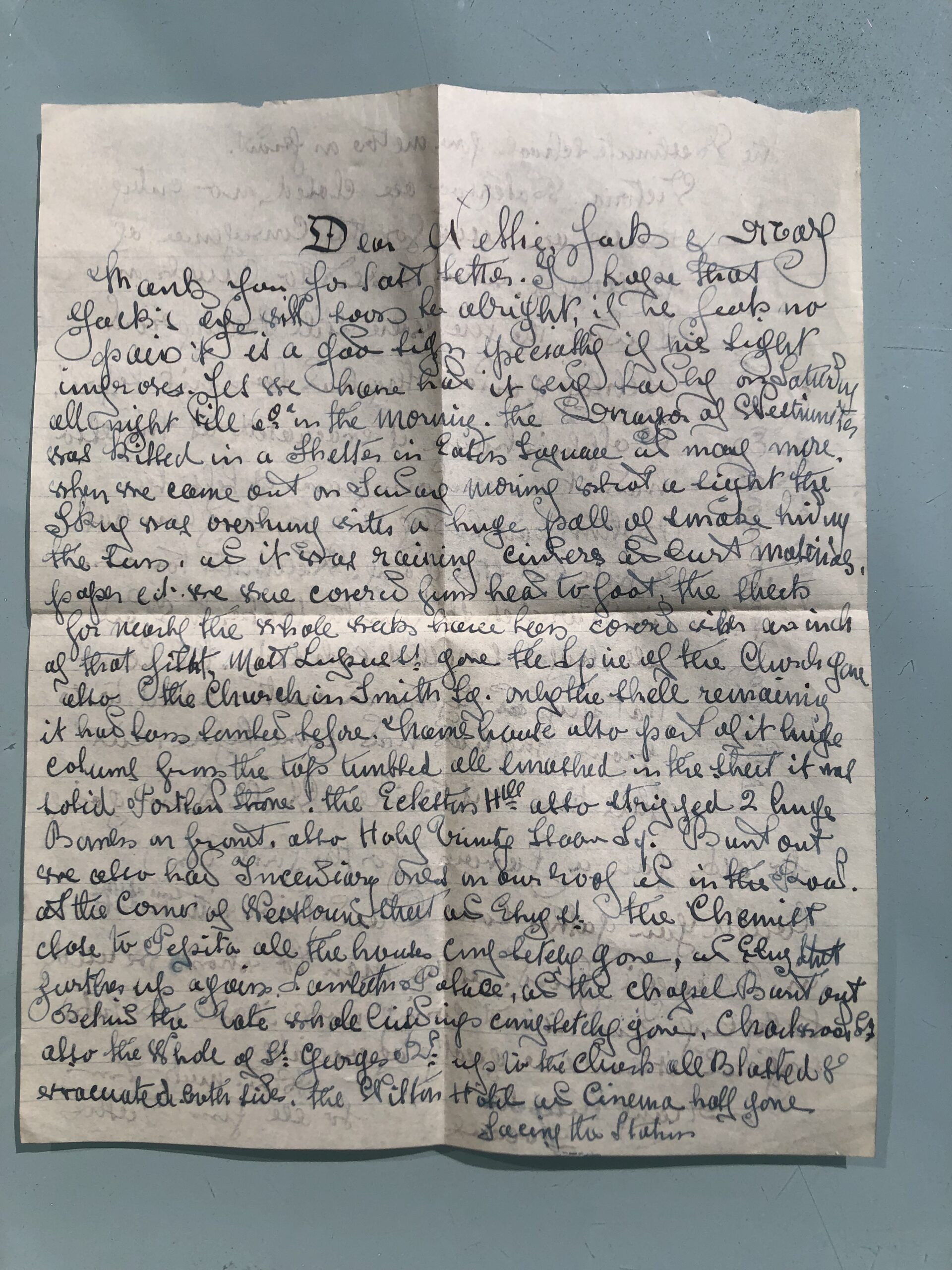 The letter is from Raymond in London, to his daughter Nellie, son-in-law Jack (my husband’s grandparents) and 12 year old granddaughter Mary (my husband’s mother) in Durham. Raymond’s flourished, cursive handwriting is hard to read, so I’ve transcribed it as best as possible.