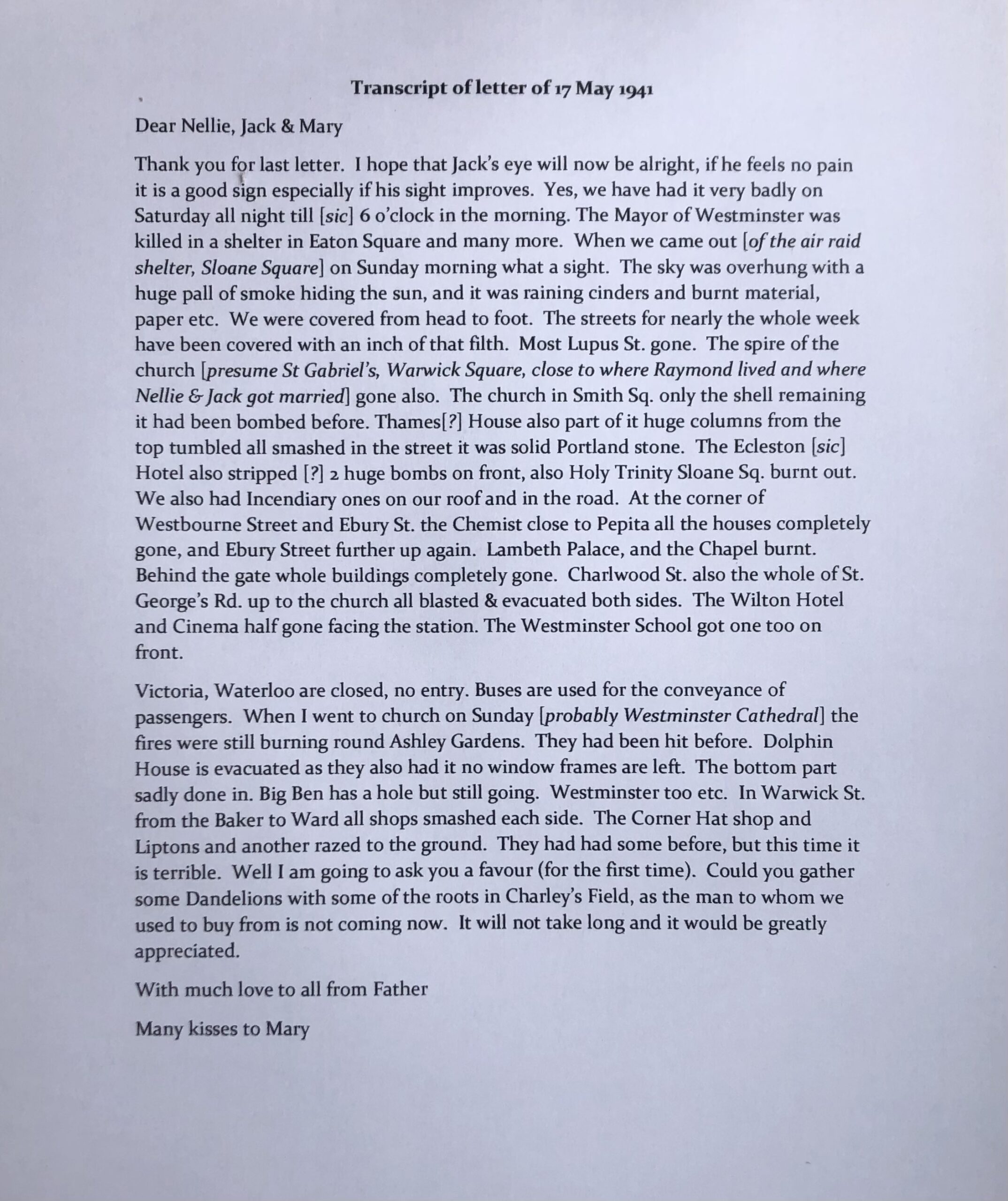 The postmark on the envelope is 17 May 1941, which means that the event Raymond is describing in his letter was the horrendous air raid of the night of Saturday 10th/Sunday 11th May 1941. He vividly recounts the devastation around him, after he’d left the Sloane Square Air Raid Shelter (of which he was warden) on the Sunday morning, and in the week after. We still have his warden’s armband and various letters from Chelsea Town Hall at that time, relating to the administration of the shelter, including one about bed-bug infestation and another about a swimming competition in the Serpentine between the various Borough shelters.