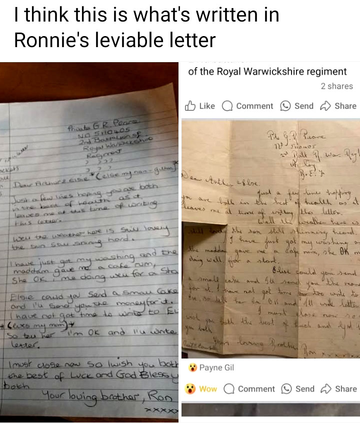 My mom had showed me Ronnie’s letter many times but nothing else. She and Elsie my nan knew nothing about Ronnie why he is buried in Ledringhem Cemetary in France. My mom Eve died four years ago and I kept on to my brother to find the letter from Ronnie. He said it’s not with my mom’s belongings.