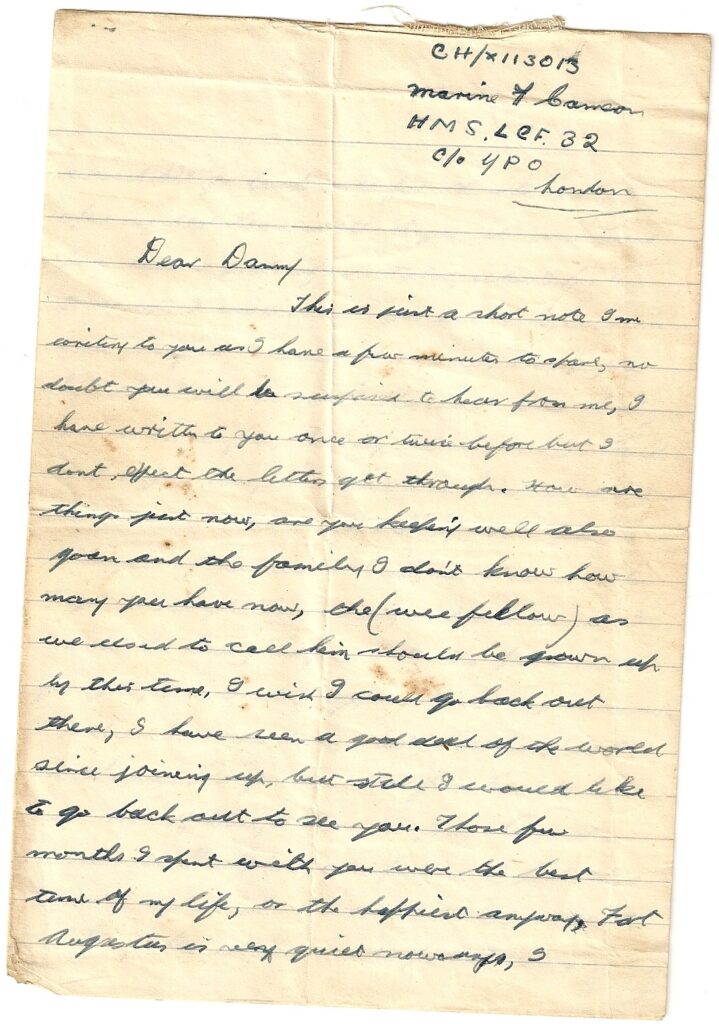 It was clear from this conversation that my father had been sent to Berneray, Isle of Lewis and had stayed on the island in idyllic surroundings. That memory is reflected in his letter his “brother” Daniel, as he reminisces about his happy times spent there. This letter was sent from LCF 32 which had seen action at D Day, Walcheren and “other raids”.