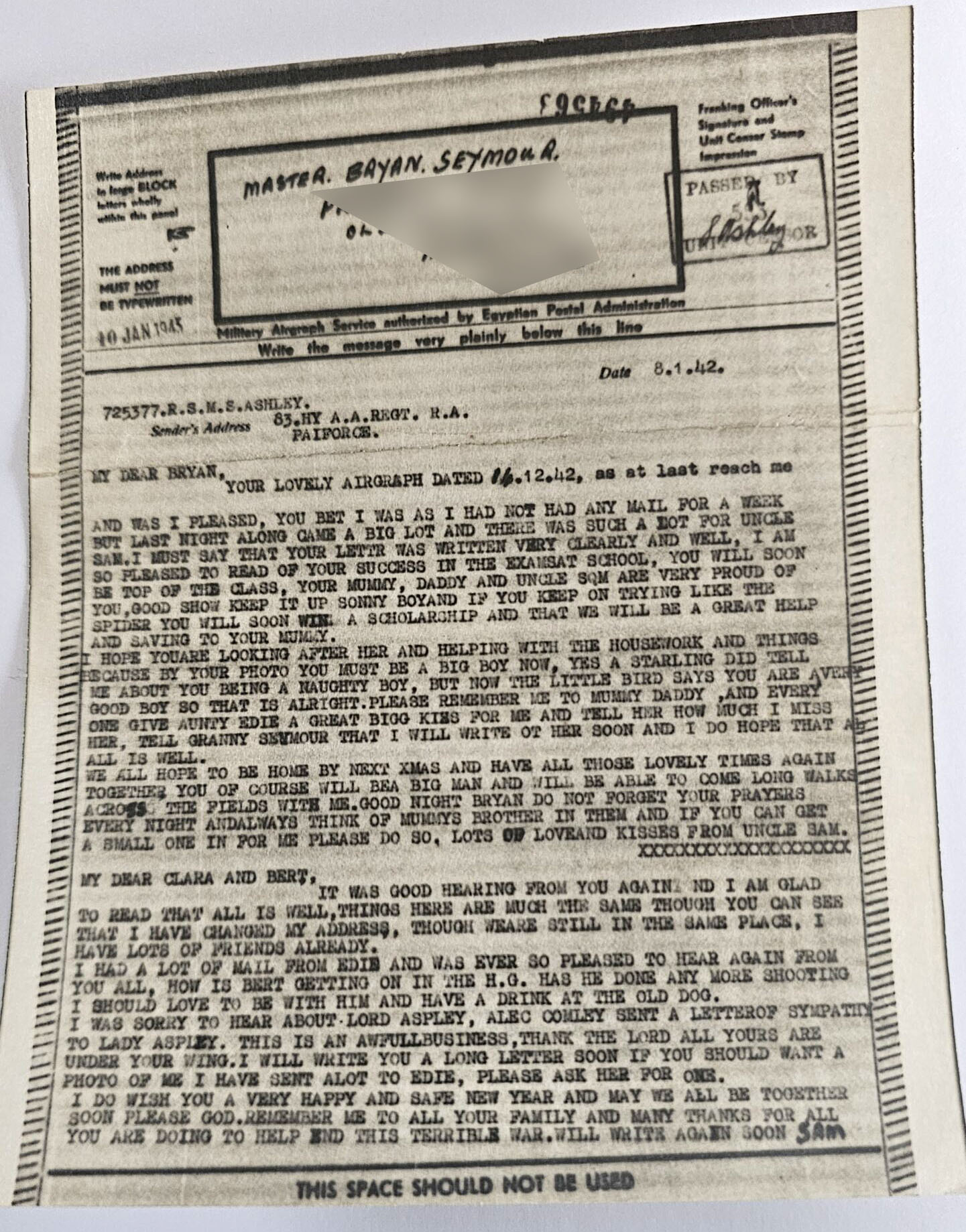 This letter is from my Great Uncle Sam Ashley MBE who was serving in the Middle East in the H.A.A. Regiment. He was awarded a Bronze Star Medal.