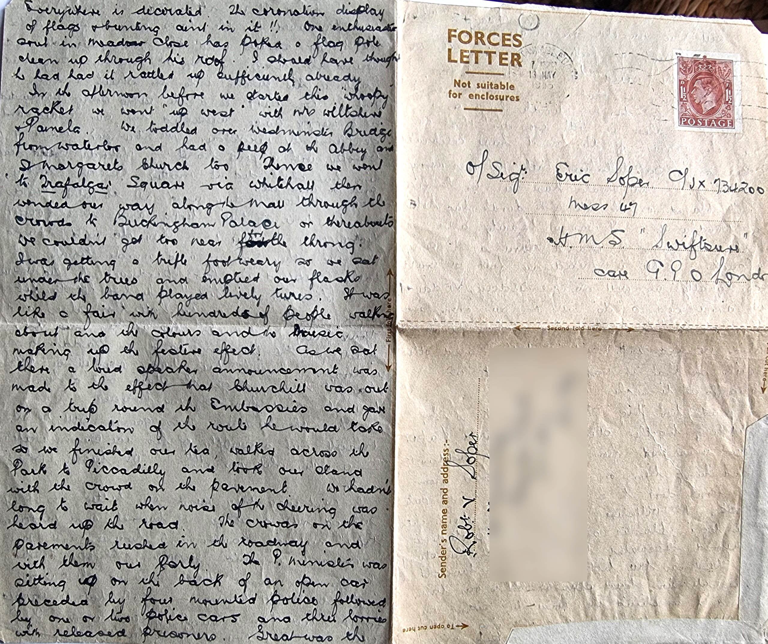 Letter ‘nr.3’ found dated 10 May 1945 (VE day +2) , to Mess 47, HMS Swiftsure.