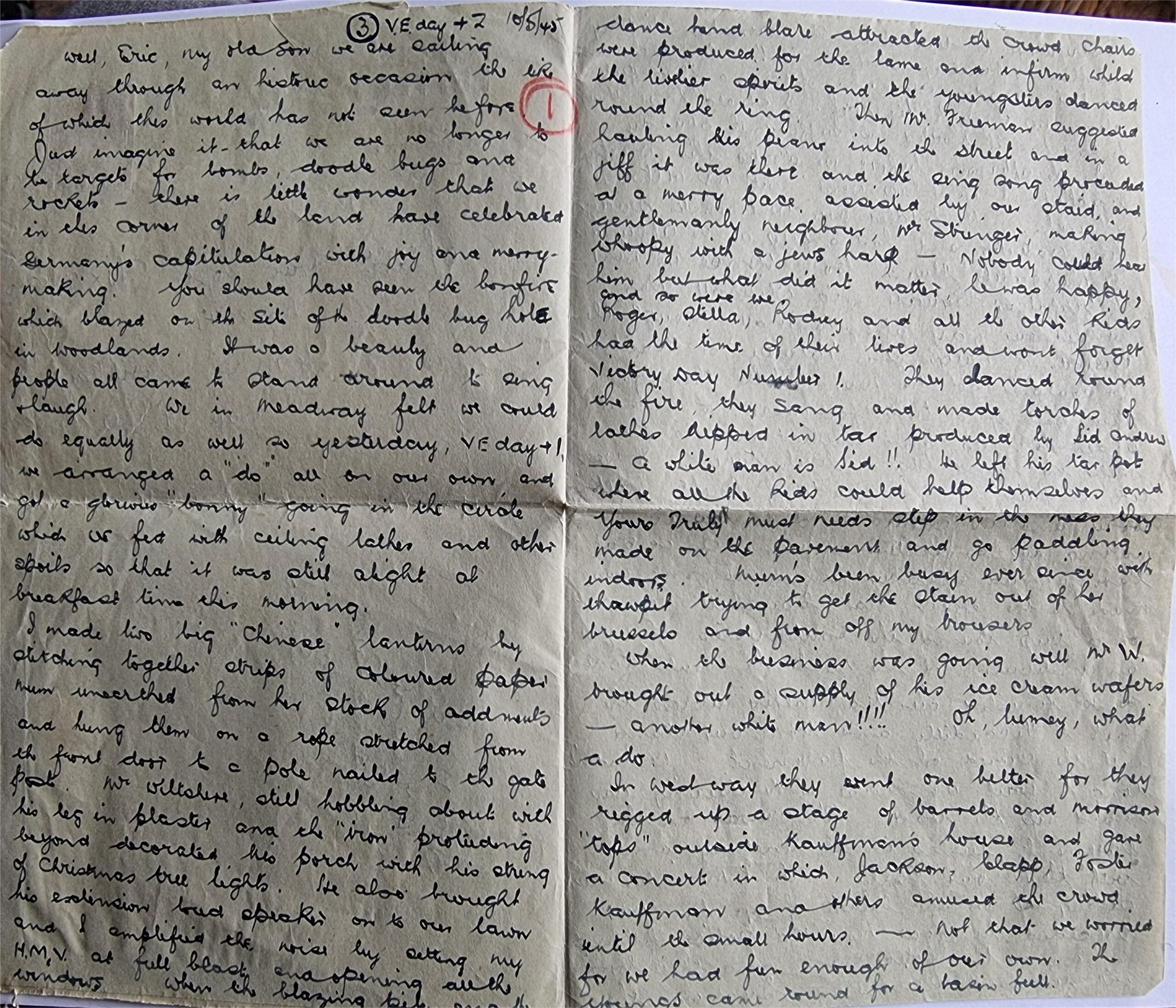 Well Eric, my dear old son, we are sailing away through a historic occasion the like of which this world has not seen before. Just imagine it – that we are no longer to be targets for bombs, doodle bugs and rockets – There is little wonder that we in this corner of the land have celebrated Germany’s capitulation with joy and merry-making. You should have see the bonfire which blazed on the site of the doodle bug hole in Woodlands. It was a beauty and people all came to stand around to sing & laugh. We in Meadway felt we could do equally as well so yesterday, VE Day +1, we arranged a ‘do’ all on our own and got a glorious ‘bonny’ going in the circle which we fed with ceiling lathes and other spoils so that it was still alight at breakfast this morning.