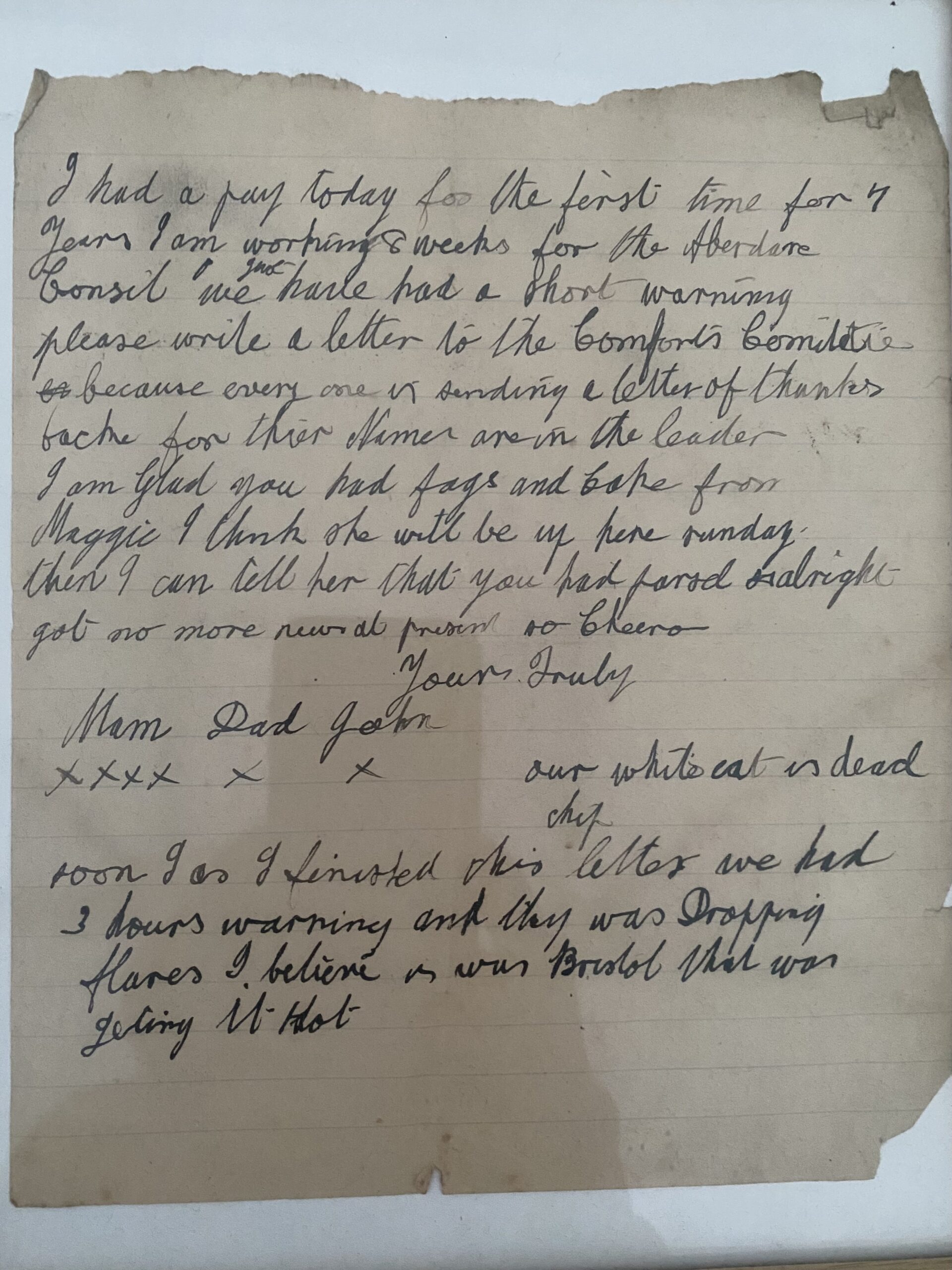 Just a line in answer to your letter which we had to day thursday glad to hear that you are alright as it leaves at present we have had warnsing every day and night last 3 weeks sunday night we had a hell of a night Jerry was dropping flares and then he dropped 100 fire bombs and H.E. Bombs at Hirwain he blew up the road between Aberdare and Hirwain and blew 1 street down and a garage but nobody was killed only a couple injured and droped some time Bombs on the Mountain we had the King and Queen at Cardiff and Swansea. Swansea is flat on the floor from the sands up to the [unclear - station?] they had it was then Coventry 2000 was killed I am a spoter from our Church and John Dispatch order for the A.R.P. he is up every night he is on duty now.
