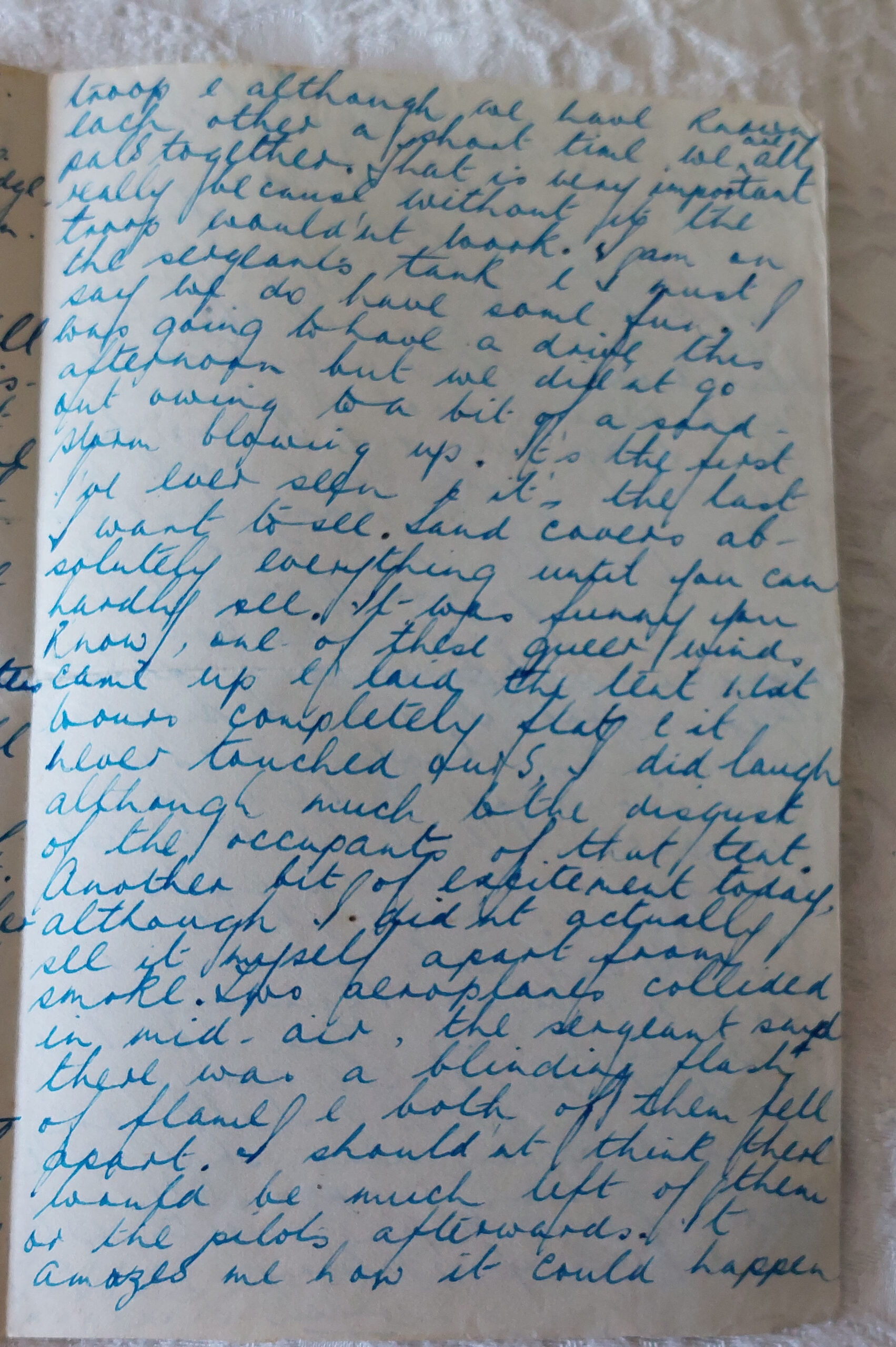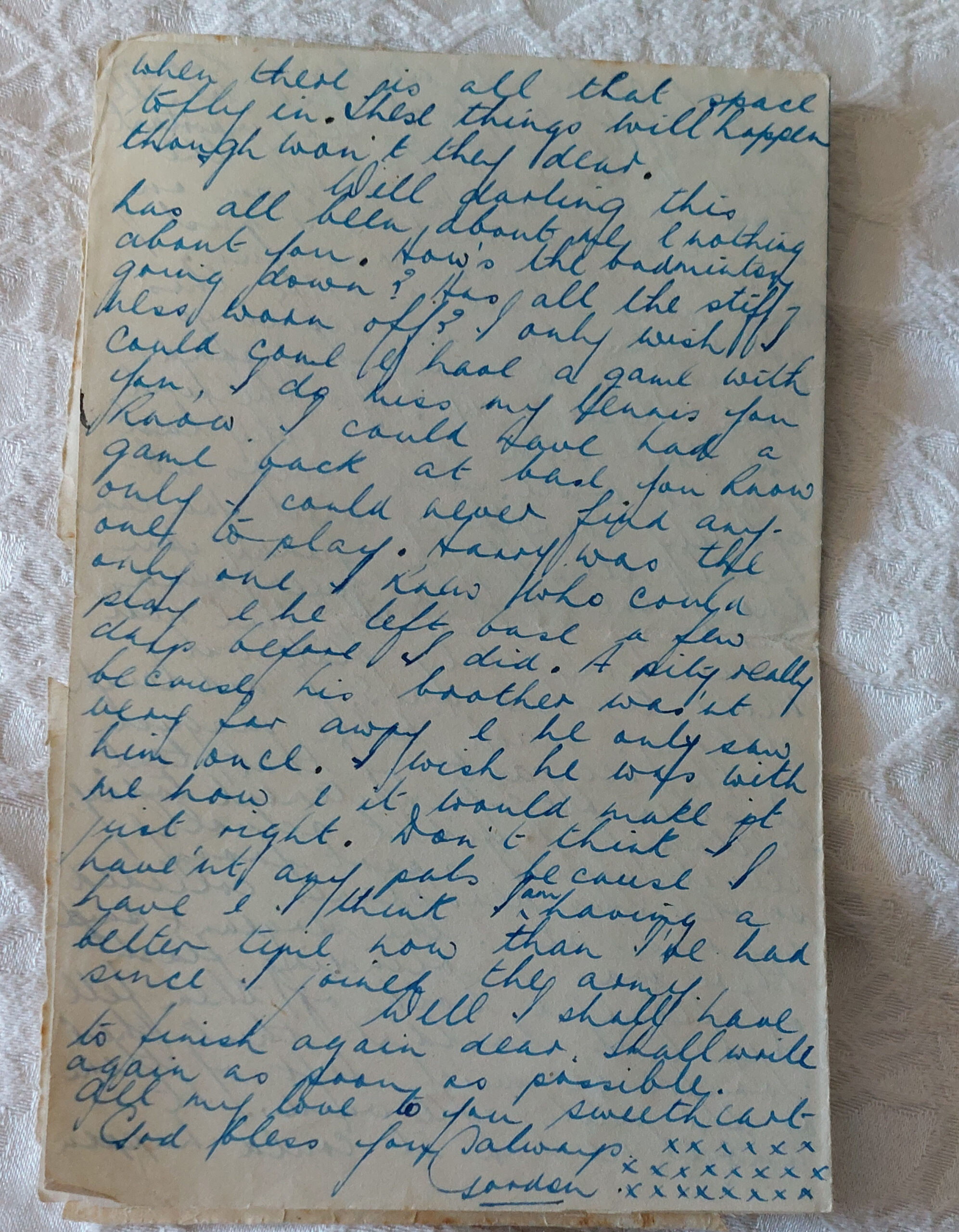 I have over 120 letters written by my mother’s fiance from August 1942 when he was conscripted, covering the time of training in S. W. England, through embarkation to Cairo, Egypt and finally in January 1944 to Italy. My mother kept them securely and after she died in 2010, I now treasure them too. They are part of our family history.