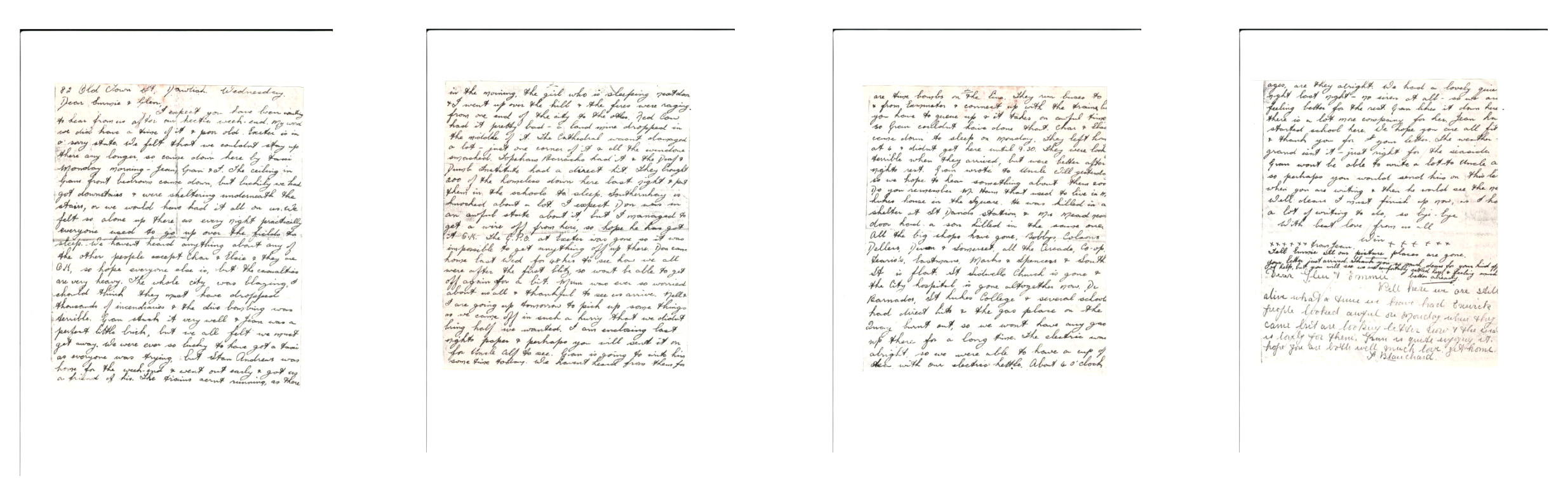 I expect you have been waiting to hear from us after our hectic weekend. My word we did have a time of it and poor old Exeter is in a sorry state. We felt that we couldn't stay there any longer, so came down here by train Monday morning - Jean, Gran and I. The ceiling in Gran's front bedroom came down but luckily we had got downstairs & were sheltering underneath the stairs, or we would have had it all on us. We felt so alone up there as every night practically everyone used to go up over the fields to sleep. We haven't heard anything about any of the other people except Chas & Elsie & they are OK so hope everyone else is, but the casualties are very heavy. The whole city was blazing, I should think they must have dropped thousands of incendiaries & the dive bombing was terrible. Gran stuck it very well & Jean was a perfect little brick, but we all felt we must get away. We were ever so lucky to have got a train as everyone was trying but Stan Andrews was here for the weekend and went out early & got us a friend of his. The trains arent running as there are live bombs on the line. They run [unclear] to & from Exminster [?] & connect up with the trains [unclear] you have to queue up & it takes an awful time so Gran couldn't have done that. Chas & Elsie came down to sleep on Monday. They left home at 6 & didn't get here until 9.30 they were looking terrible when they arrived, but were better after a nights rest. Gran wrote to Uncle Will [unclear] so we hope to hear something about there [unclear]. Do you remember [unclear] that used to live in the [unclear] house in the Square. He was killed in a shelter at St Davids Station & Mrs Mead next door had a son killed in the same one. All the big shops have gone, Bobbys, Colson's, Dellers, Devon & Somerset, all the Arcade, Co-op, [unclear], Eastmans, Marks & Spencers & South St is flat. St Sidwells Church is gone & the City Hospital is gone altogether now. Dr Barnados, St Lukes College & several schools had direct hits & the gas place on the [unclear] burnt out, so we won't have any gas up there for a long time. The electric was alright so we were able to have a cup of tea with our electric kettle. About 4 o'clock in the morning, the girl who is sleeping next door & I went up over the hill & the fires were raging from one and of the city to the other. Red Cow had it terribly bad - a land mine dropped on the middle of it. The Cathedral wasn't damaged a lot - just one corner of it & all the windows smashed. Topsham Barracks had it & the Deaf & Dumb Institute had a direct hit. They brought 200 of the homeless down here last night & put them in the schools to sleep. Southernhay is knocked about a lot. I expect Don was in an awful state about it, but I managed to get a wire off from him, so hope he had got it O.K. The G.P.O. at Exeter was gone so it was impossible to get anything off up there. Don came home last Wed for 48 hours to see how we all were after the first blitz, so won't be able to get off again for a bit. Mum was ever so worried about us all & thankful to see us arrive. Nell & I are going up tomorrow to pick up some things as we came off in such a hurry that we didn't bring half we wanted. I am enclosing last nights paper & perhaps you will sent it on for Uncle Alf to see. Gran is going to write him some time today. We haven't heard from them for ages, are they alright. We had a lovely quiet night last night - no sirens at all - so we are feeling better for the rest. Gran likes it down here there is a lot more company for her. Jean has started school here. We hope you are all fit & thank you for your letter. The weather is grand isn't it - just right for the seaside. Gran won't be able to write a lot to Uncle Alf so perhaps you would send him on this letter when you are writing & then we would see the news. Well dear I must finish up now, as I have a lot of writing to do, so bye bye.